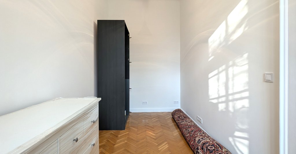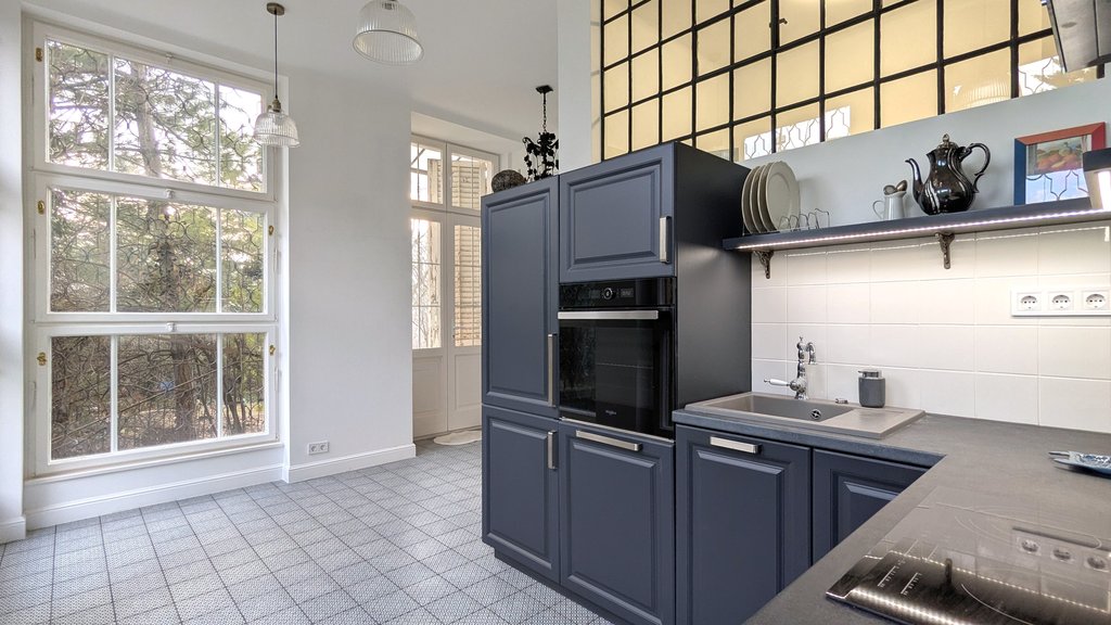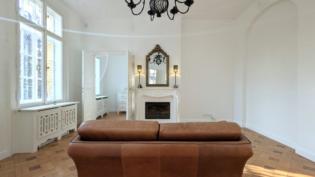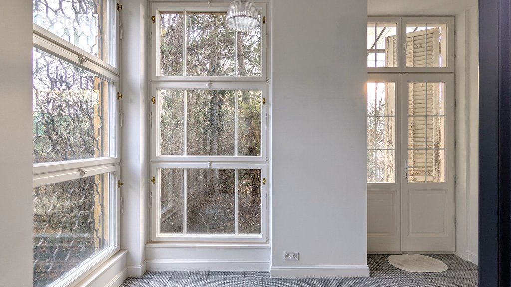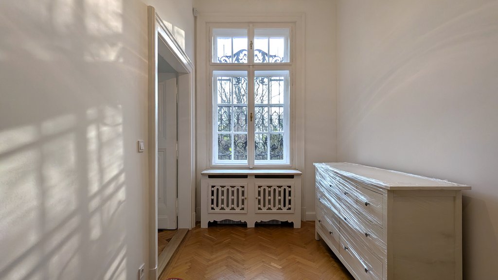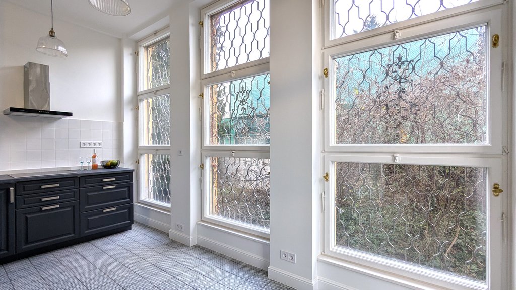 A freshly renovated (2024), in a beautiful villa, an unfurnished property is for rent. The garden connected apartment consists of a bedroom, a large kitchen with dining area, a bathroom with a bathtub, and a living room with a cosy fireplace. Underfloor heating is installed int he kitchen and bathroom. The property has air-condition and is alarm protected. The heating system was renovated as well. The garden is common used but there is a separated garden that can be enjoyed by the tenants only. A courtyard parking lot belongs to this beautiful flat. It can also be a representative office. The wrought-iron work was made by an award winning smith. Bus stops are nearby: 91, 191, 291.