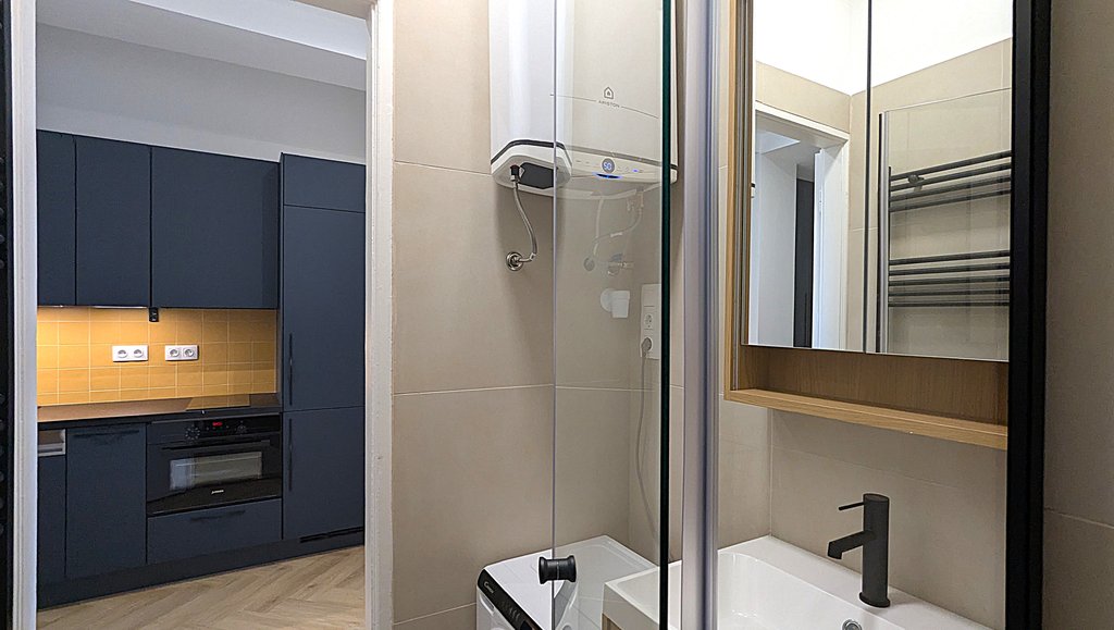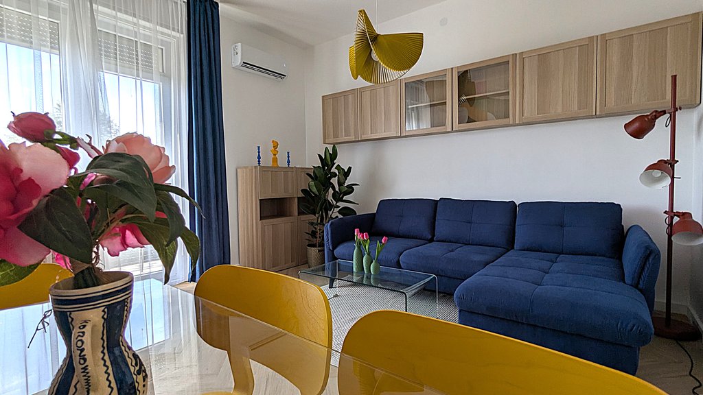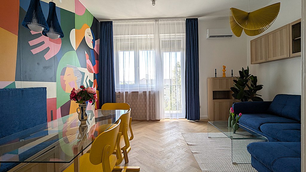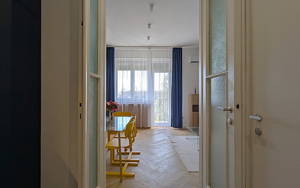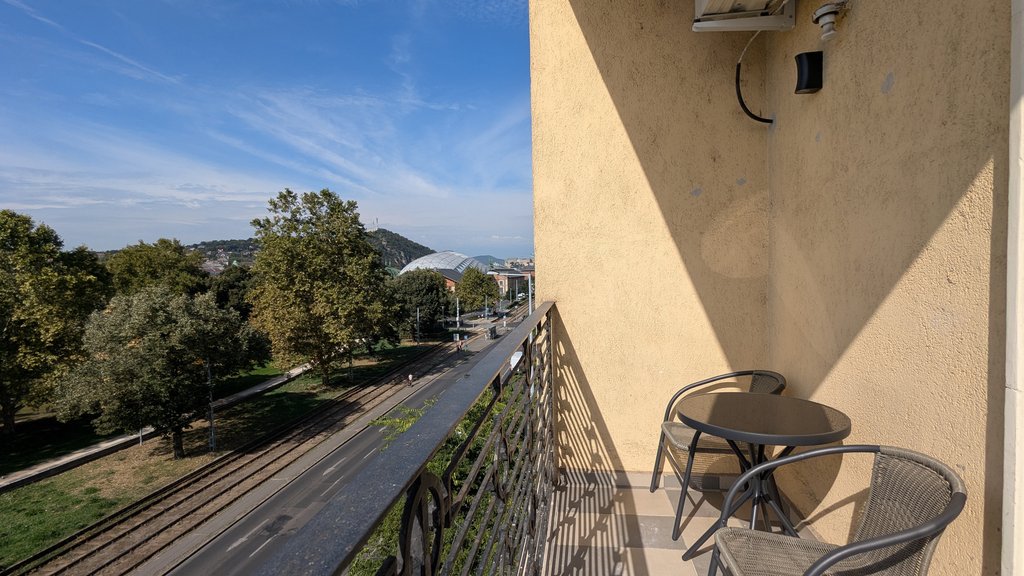 In the 9th district, a beautifully renovated, sunny studio apartment is for rent, with a breathtaking panorama of the Danube and the Buda hills. The Bauhaus-style, third-floor, air-conditioned property has a living room with a balcony, a kitchen, a bathroom with a shower and a separate toilet. An outdoor parking lot belongs to the property. It is located in a nearby street. The area has excellent public transportation, Vásárcsarnok, and Fővám tér within walking distance, and Ráday utca, with its nightlife, is a 5-minute walk away. Metro line 4 and tram line 47-49 stop in front of Corvinus University, tram lines 4-6 can be reached in the other direction, and tram line 2 stops in front of the house.