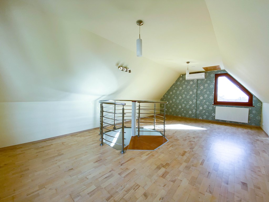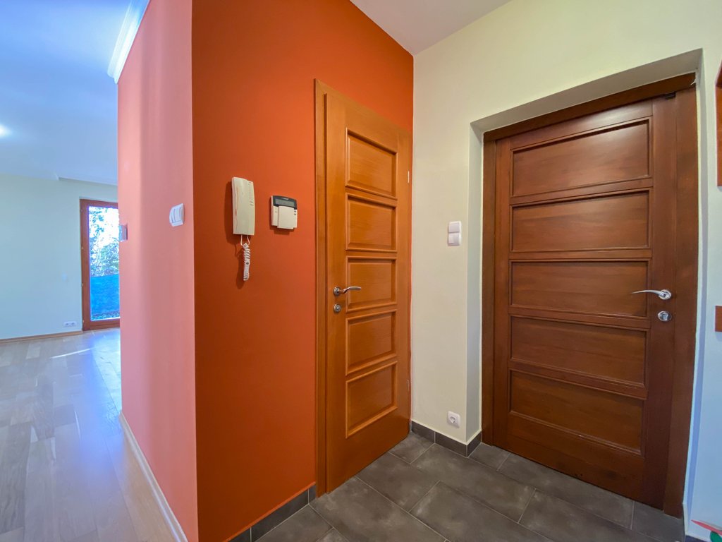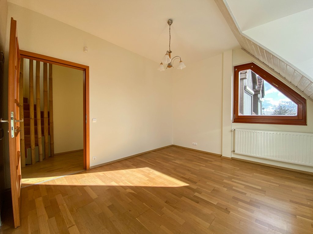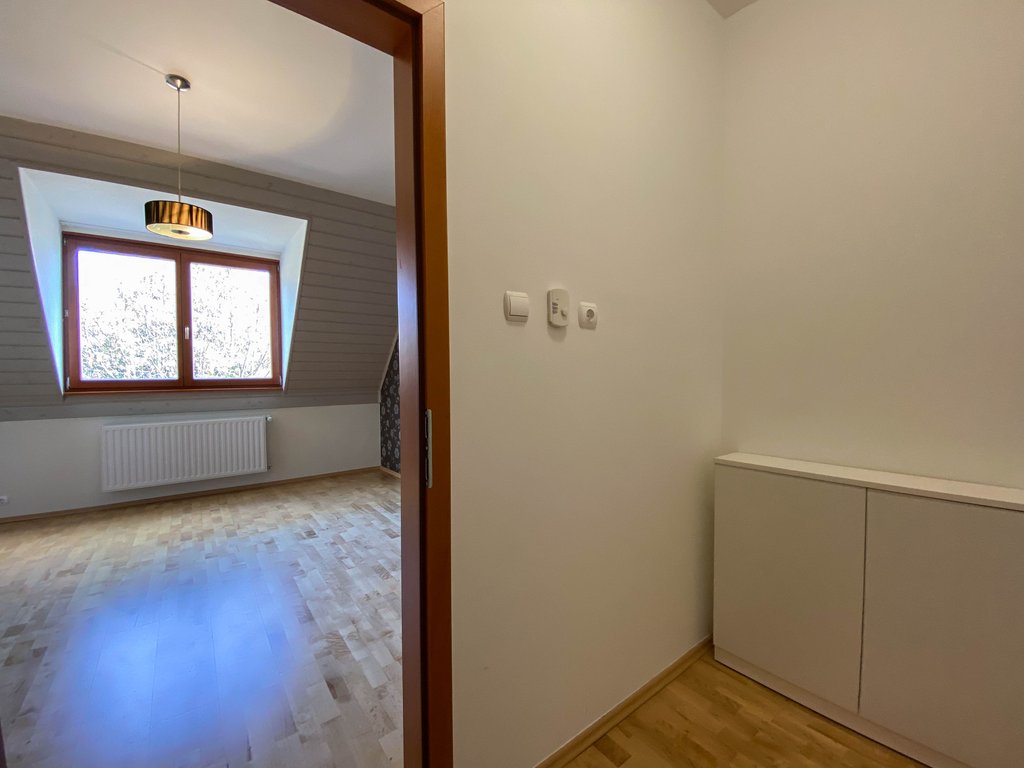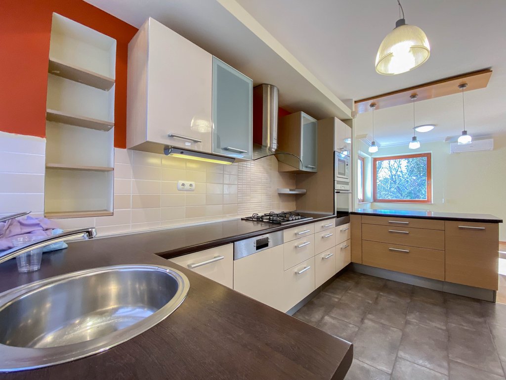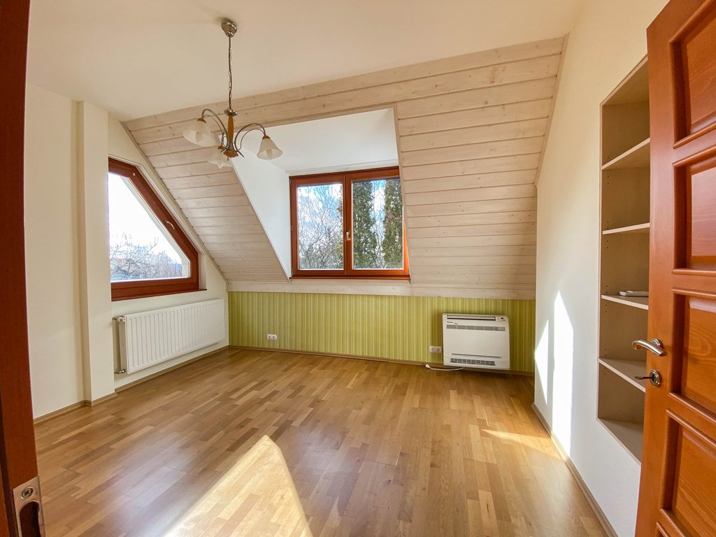 In the neighborhood of a nature conservation area, a semi-detached house with excellent facilities is for rent in the 12th District. On the entrance level of the house there is a living room with an open plan kitchen, which is connected to a terrace facing the street and the garden, and a guest toilet. On the first floor there are 3 nice bedrooms, a wardrobe and a bathroom with a bathtub. On the top floor, there is an air-conditioned room with beautiful view to the forest and the city. On the basement level there is a hobby room, a Finnish sauna with a huge shower, a toilet, a laundry room and storage. The property is equipped with alarm system, 1 car can comfortably park in the yard of the house, another 2 cars can park right in front of the house. It has its own garden. Unfurnished, available immediately.