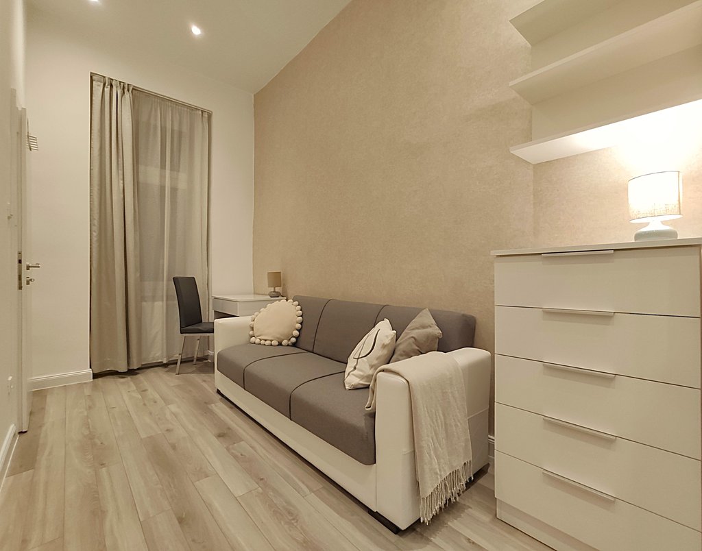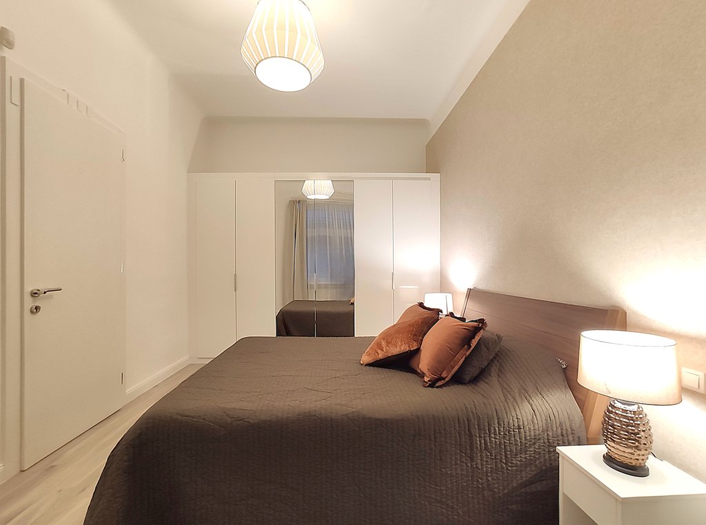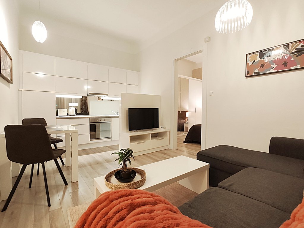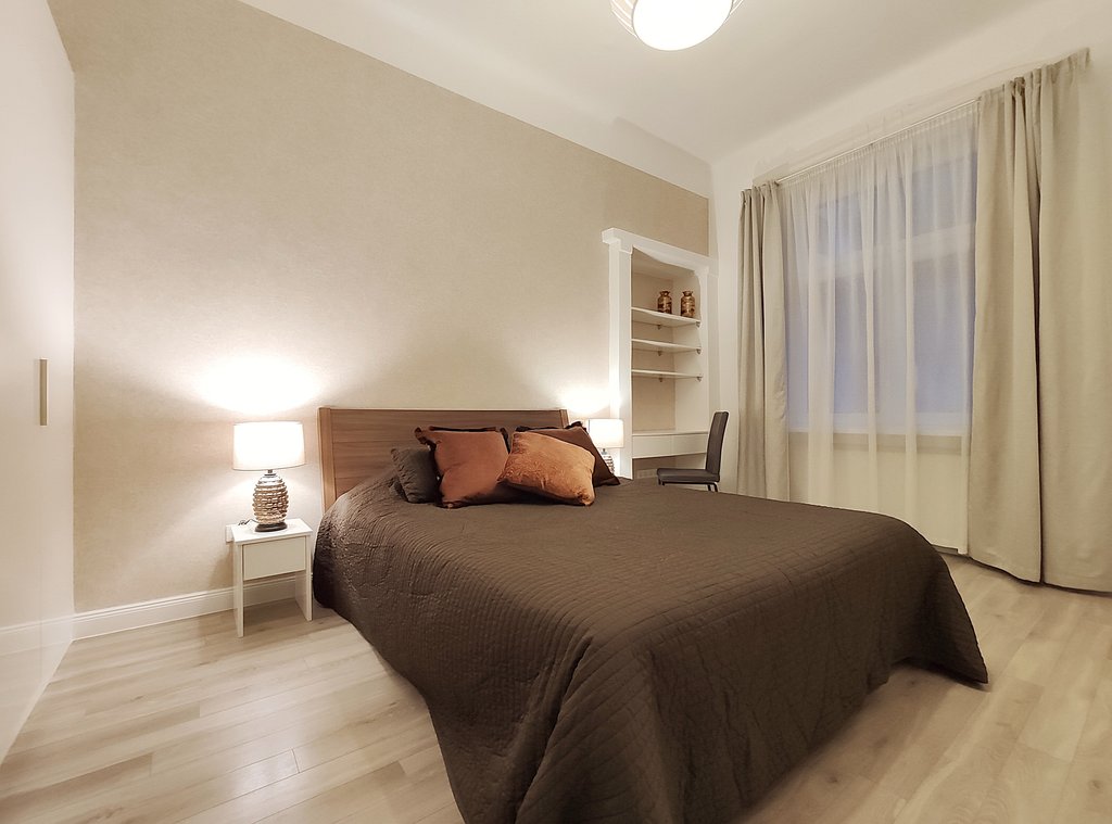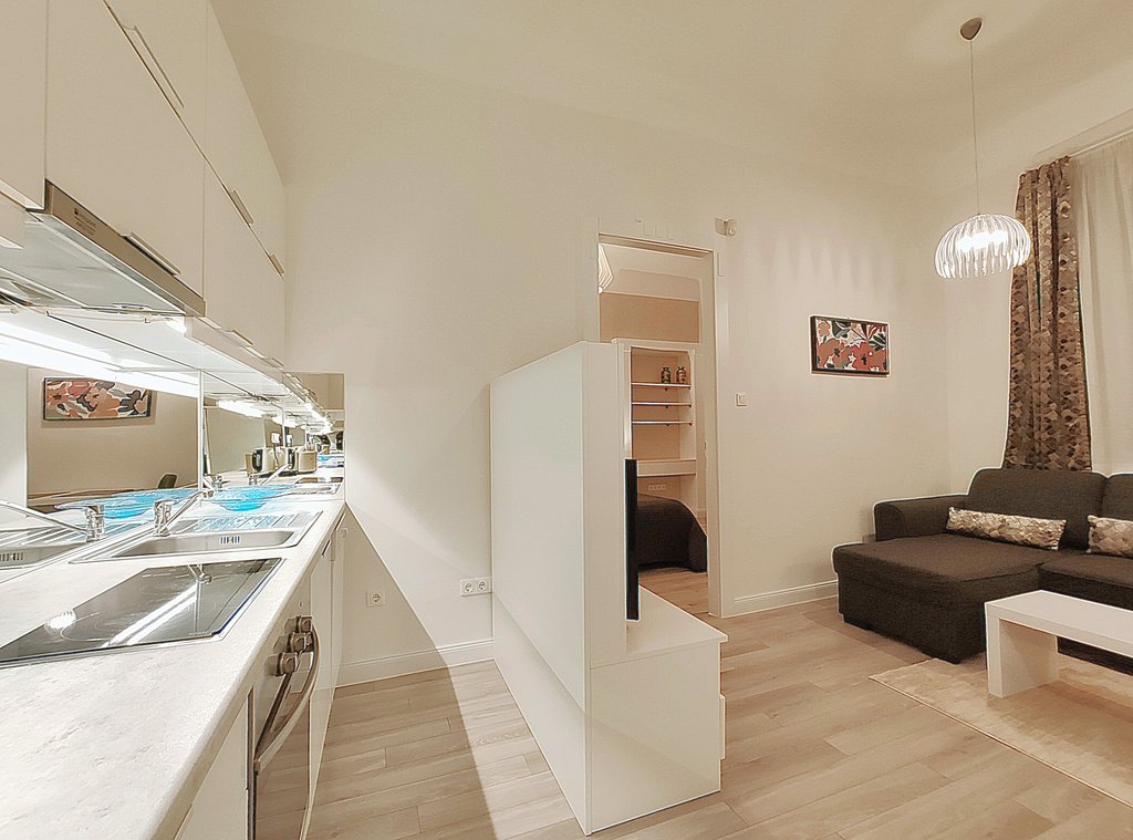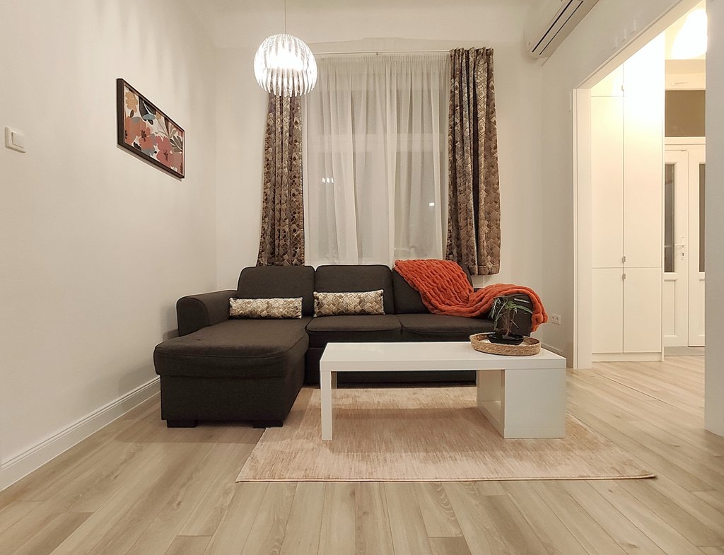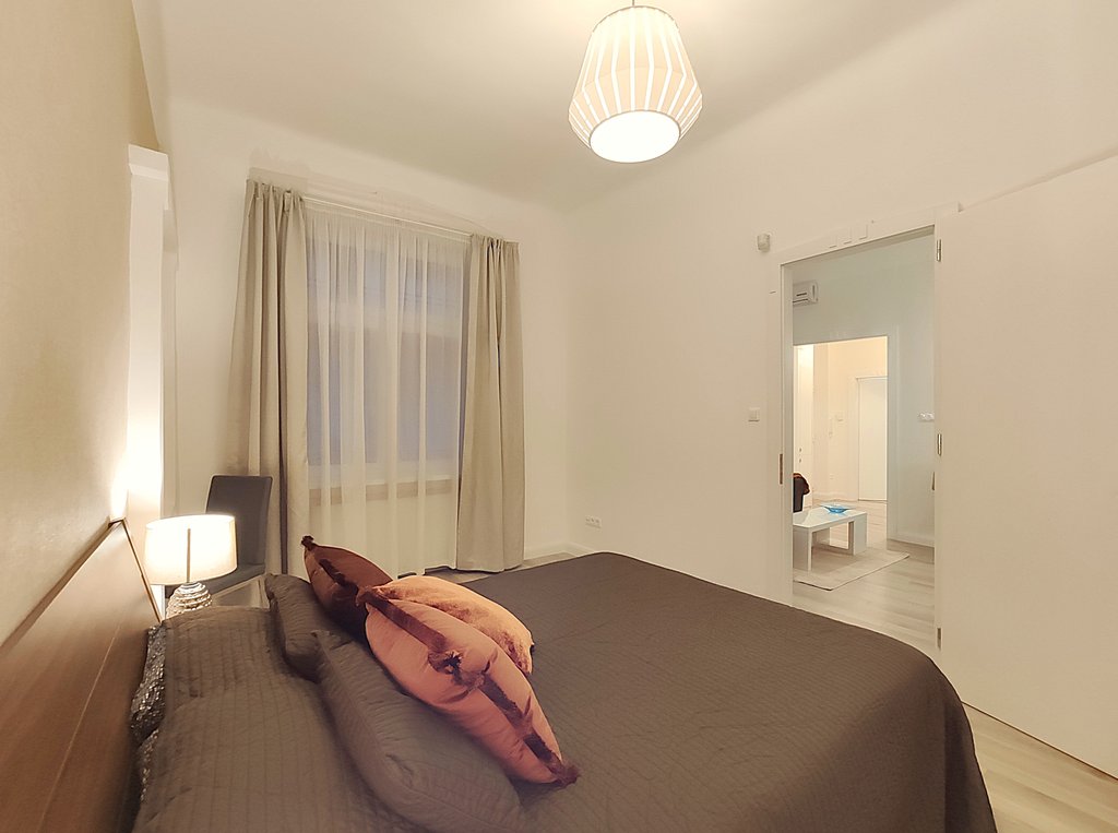 In the heart of the 6th district, at Pesti Broadway, a fully furnished, air conditioned and equipped 2-bedrooms modern apartment is for rent. As the property is located on the 2nd floor, it is sunny and because it is facing to the courtyard, it is absolutely quiet. Perfect layout, pleasant colors, built-in cupboards, top quality furniture ensures relaxing and comfortable everyday life for the tenants. The kitchen is fully equipped among others with dishwasher as well. If you would like to enjoy the pulsing nightlife of the downtown and have your island of peace, this is the perfect place for you! Andrássy Avenue, Liszt Ferenc Square are all in the about 1 minute to reach.