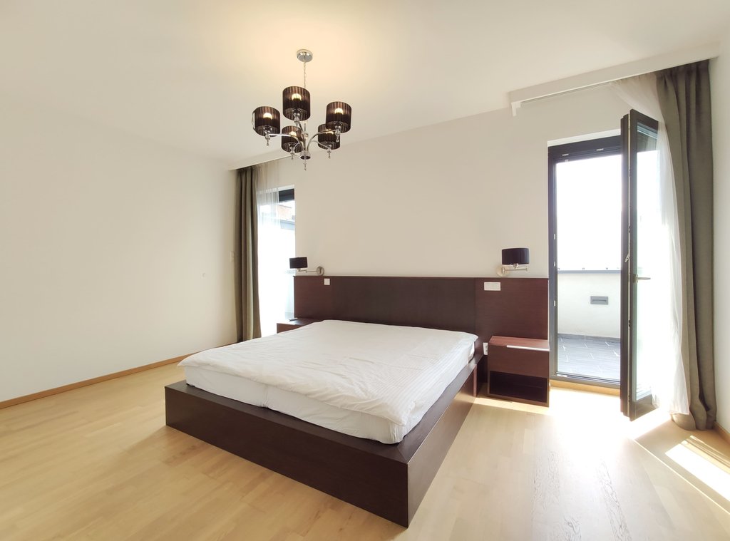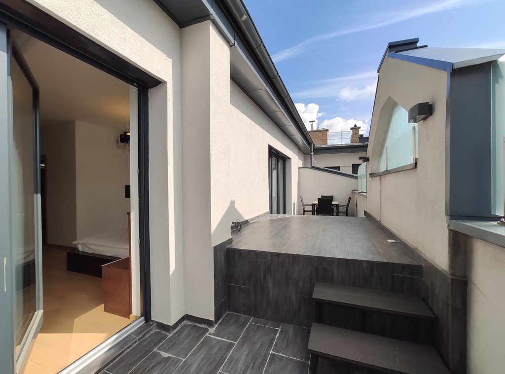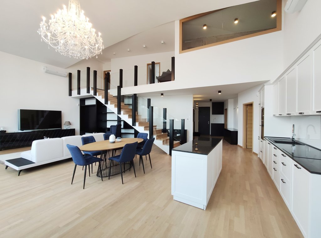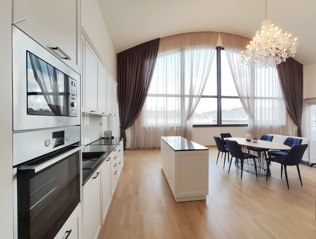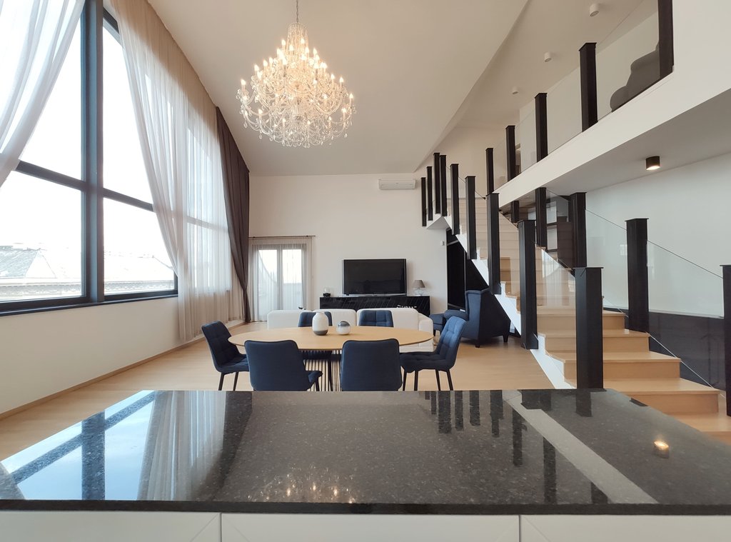 In the heart of the 5th District, near to Jászai Mari Square a newly built apartment on the top floor of a classical style, refurbished building is for rent. The 209 sqm duplex flat consists of a spacious living room with open plan kitchen, three bedrooms, three bathrooms and 4 terraces in total 37 sqm. Some of the greatest advantages of the apartment are the popular gourmet shop Culinaris Delicates, the Parliament, the riverbank Danube are within walking distance, and last but not least the lovely Margaret Island provides many opportunities for sport activities. The public transportation is excellent, metro, bus and tram stops can be reached within a few steps. We especially recommend this unique home for ambassadors, diplomats or families with children.
