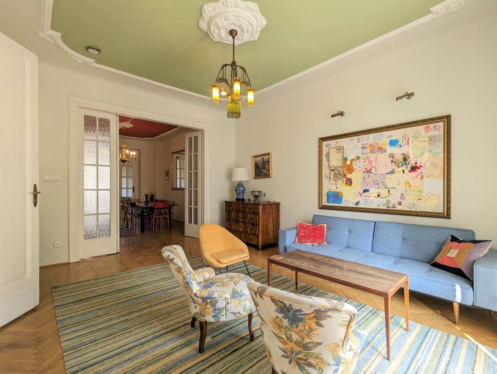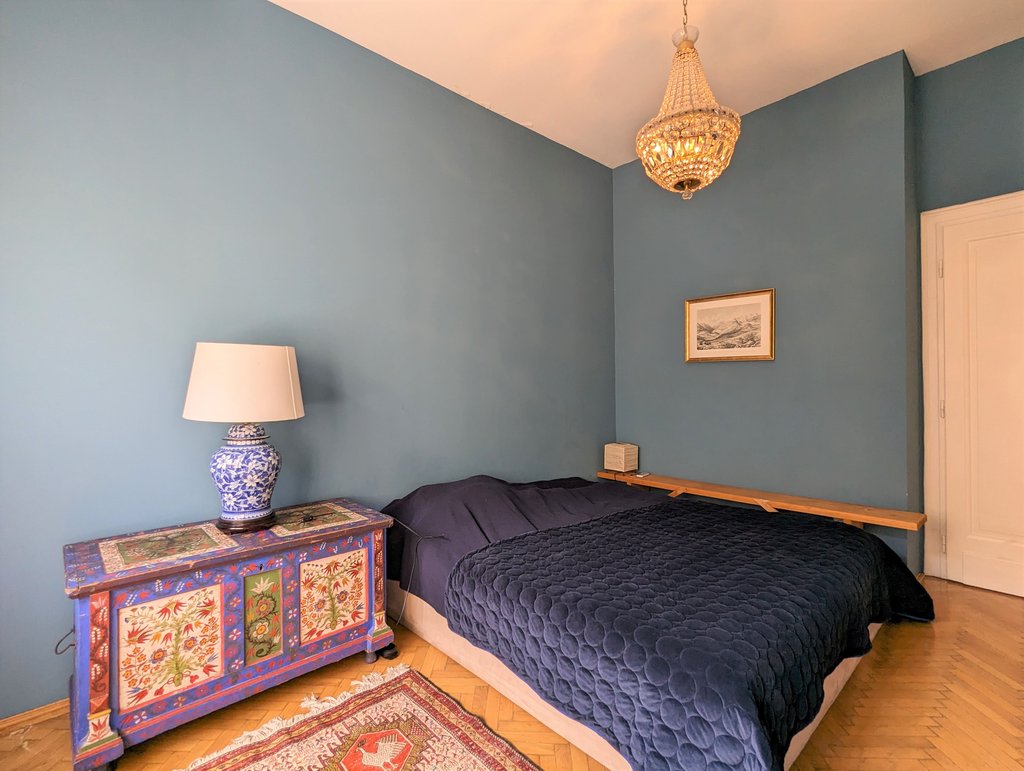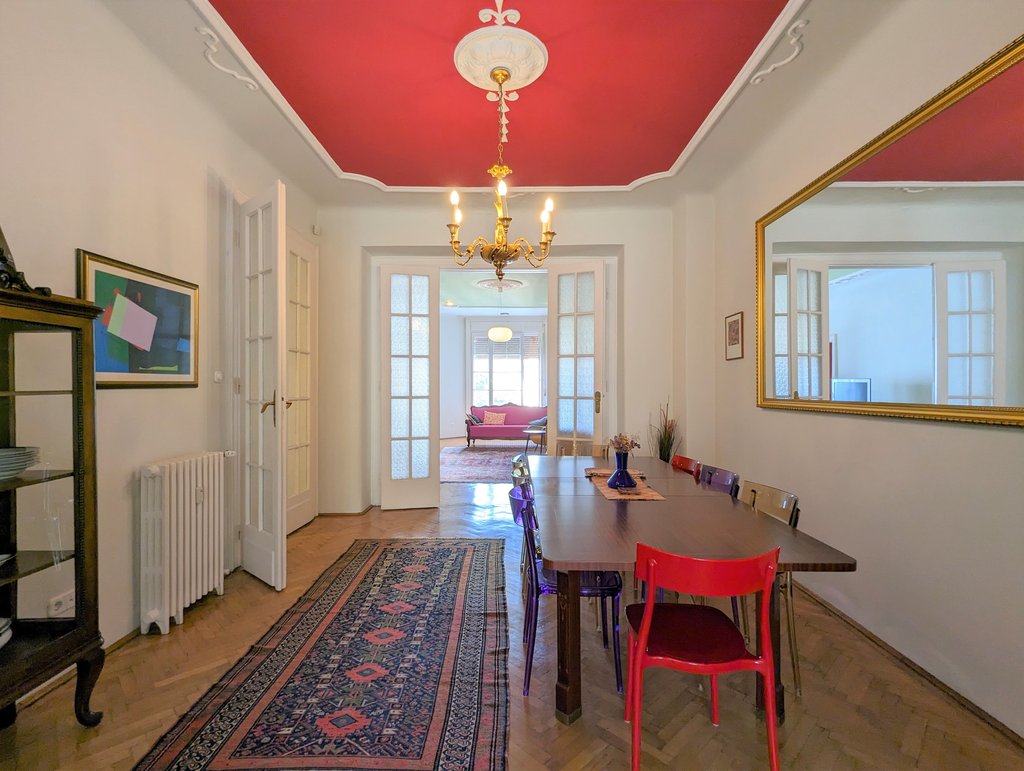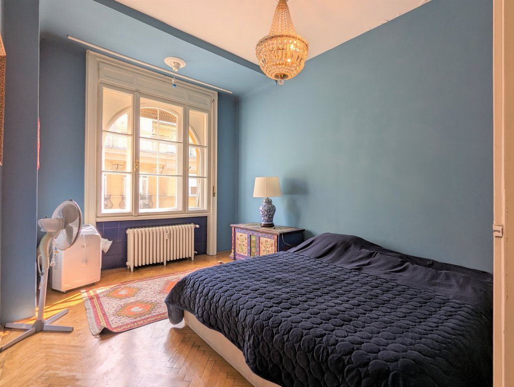 In the heart of the 13th District, Újlipótváros area, in a cozy building a, 5th floor apartment is for rent. This pleasant property is 130 sqm, very sunny and fully furnished. Currently it has 2 bedrooms, but one of the living rooms can turn into a 3rd bedroom as well. Now it consists of 2 living areas, a huge dining room, a master bedroom, a small bedroom, 2 small balconies, a walk-in closet, 1 bathroom with bathtub and toilet, 1 bathroom with shower and toilet and a separate toilet. The kitchen is fully equipped. A parking place can be rented in front of the building. The area is fantastic, several small shops, cafés, restaurants are around the house, the public transport is very good, metro and tram stations are both in few minutes away.