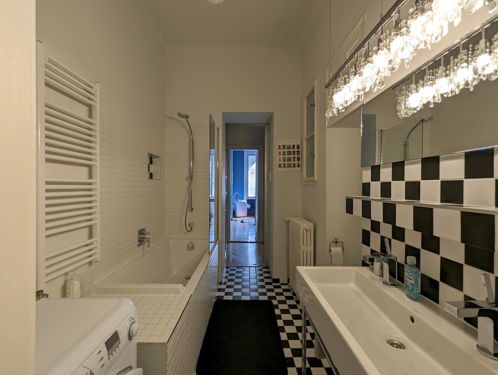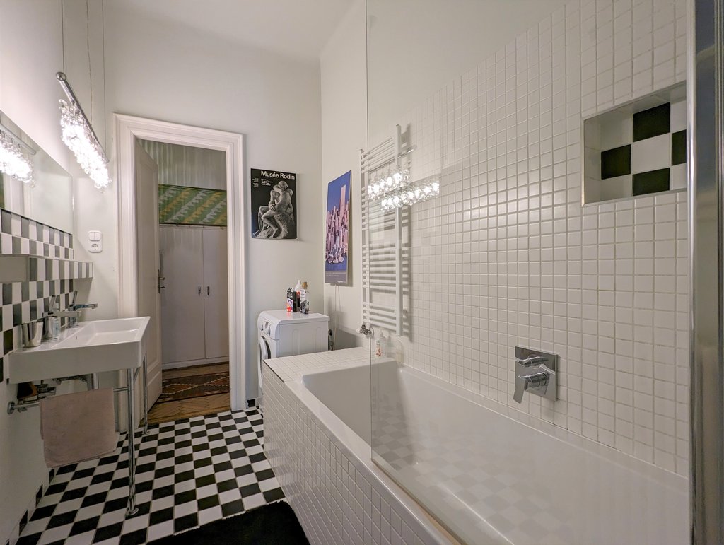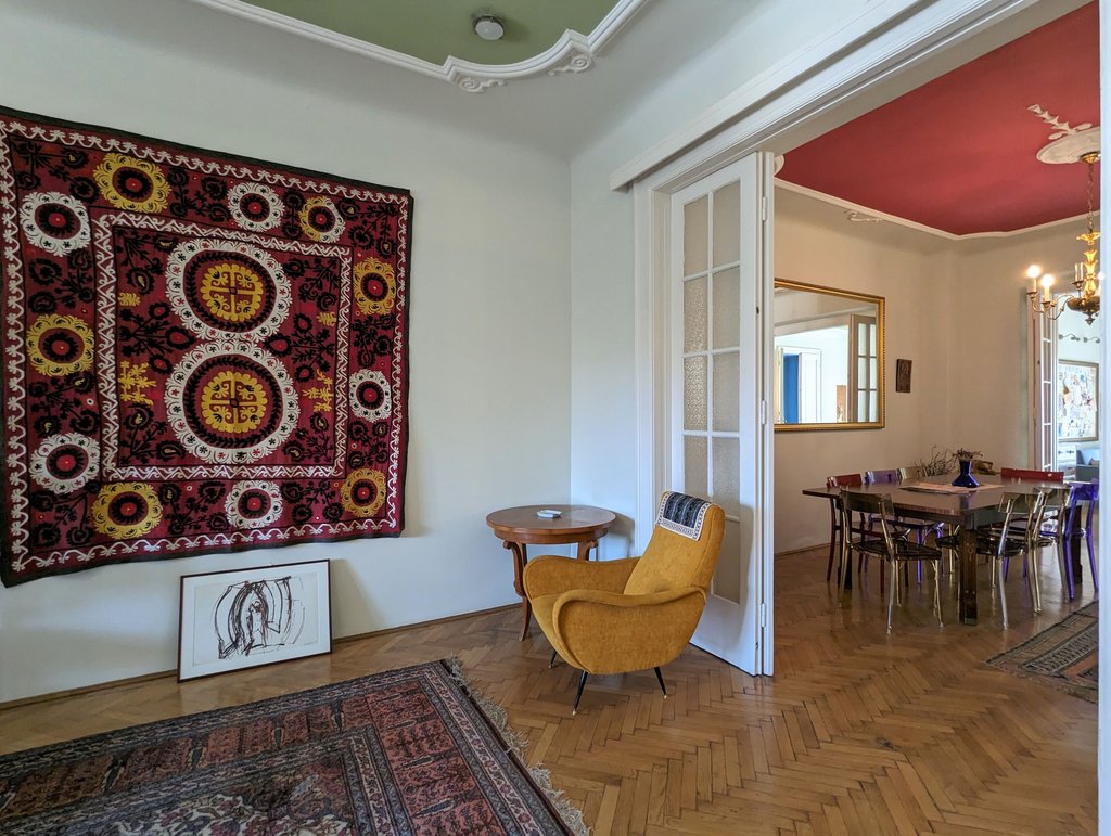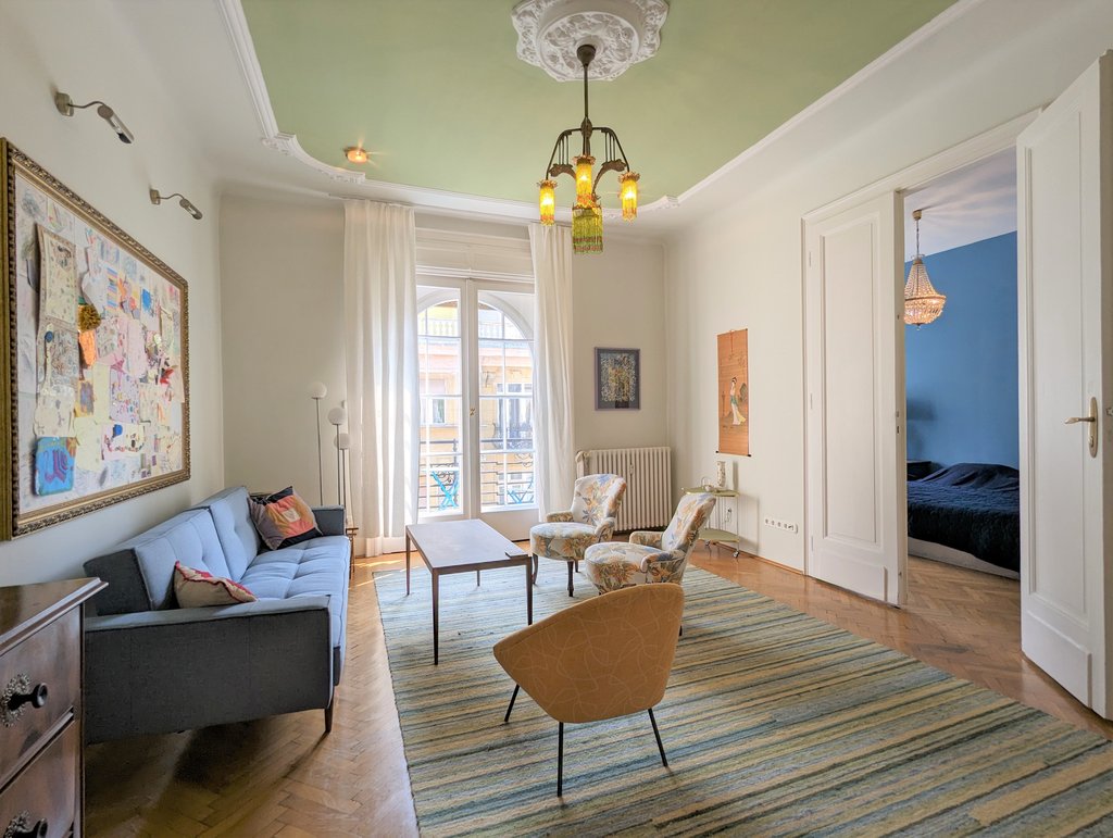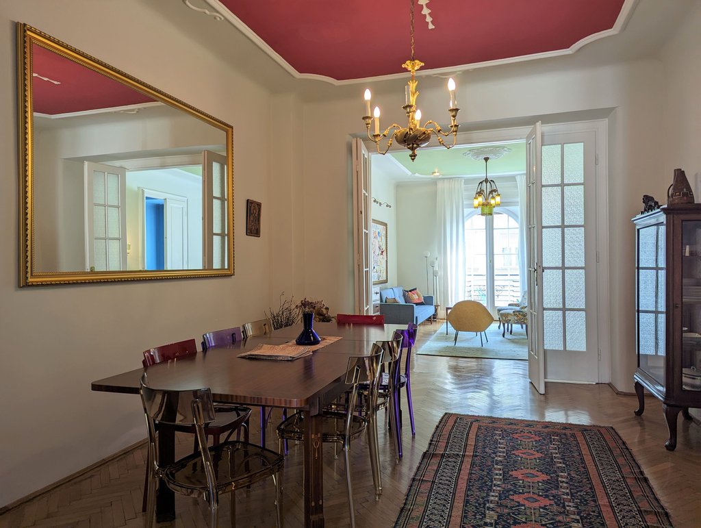 In the heart of the 13th District, Újlipótváros area, in a cozy building a, 5th floor apartment is for rent. This pleasant property is 130 sqm, very sunny and fully furnished. Currently it has 2 bedrooms, but one of the living rooms can turn into a 3rd bedroom as well. Now it consists of 2 living areas, a huge dining room, a master bedroom, a small bedroom, 2 small balconies, a walk-in closet, 1 bathroom with bathtub and toilet, 1 bathroom with shower and toilet and a separate toilet. The kitchen is fully equipped. A parking place can be rented in front of the building. The area is fantastic, several small shops, cafés, restaurants are around the house, the public transport is very good, metro and tram stations are both in few minutes away.