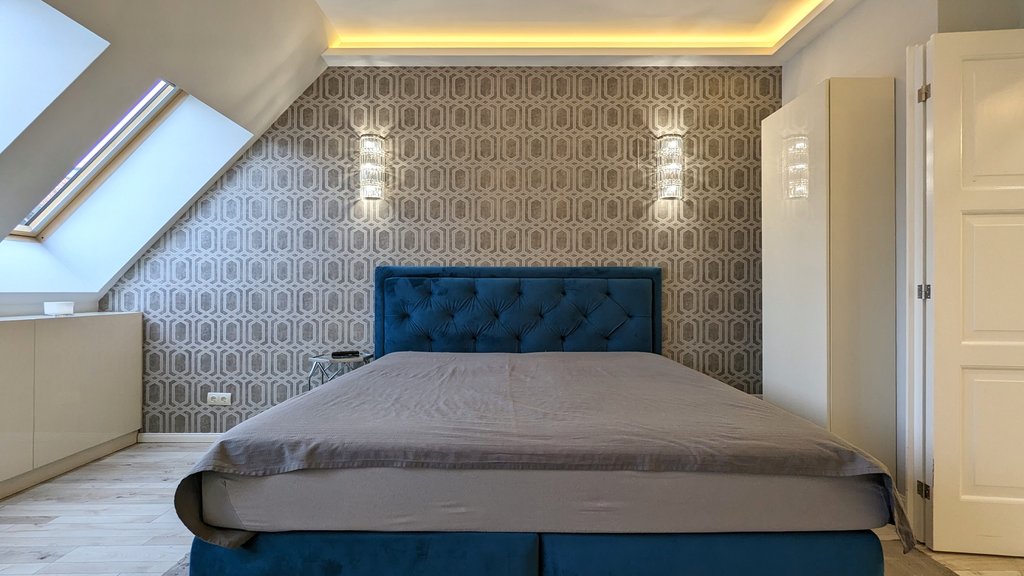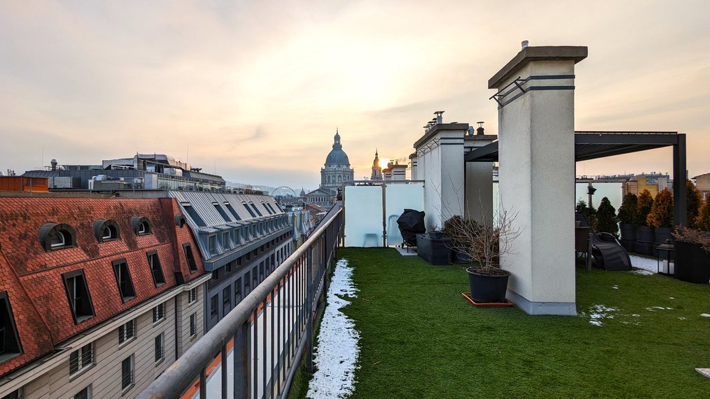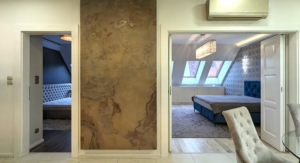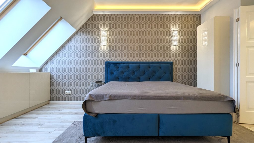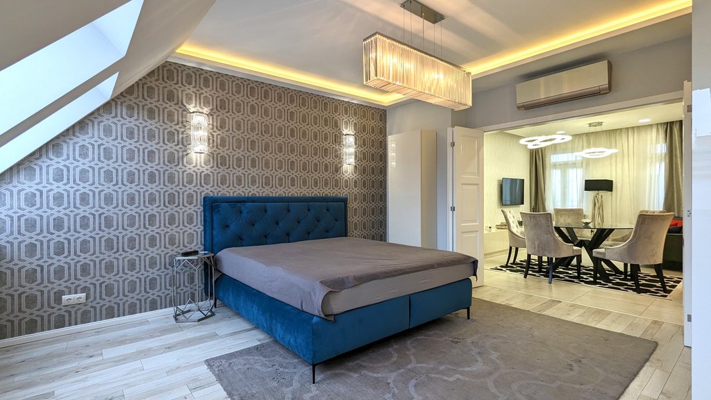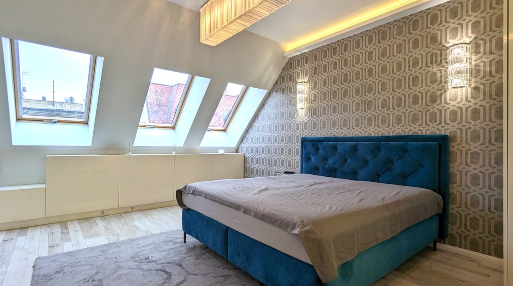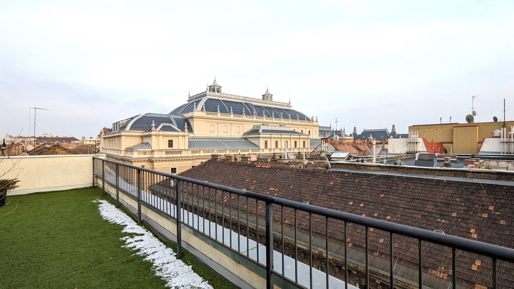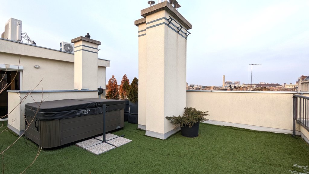 Recently renovated, exclusive, top floor apartment is for offer in the heart of the Downtown. The nicely furnished, modern property consists of an open plan kitchen with dining area and living room, a living room which can be used as a bedroom too, a separated bedroom, 2 bathrooms (one with bathub the other with shower) and a private 80 sqm rooftop terrace with amazing view over the city. The unique flat offers extras such as the top quality furniture and equipment, air-conditioner, alarm system, etc. The building with elevator has been renovated recently, so not just the cozy street, but also the building gives special charm for the area. In the nearby streets are many theatres, cafes and popular restaurants.