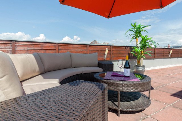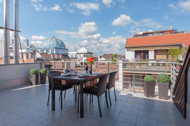 Recently renovated, nicely designed apartment is available for rent with central location, in the VI. district. The furnished, 112 sqm property is located on the 6th floor of a modern building with elevator. The air-conditioned flat consists of a lovely half-closed kitchen, a stylish living room with dining area, 2 bedrooms and 2 bathrooms- one with shower, the other with bathtub. The living room has access to the 20 sqm terrace. In addition, 80 sqm roof terrace belongs to the property, which is a perfect place for dinners with friends and family. The area offers countless options for shopping and entertainment: famous cafes, restaurants, bars and the Deák Ferenc square are in walking distance. The Oktogon can be reached easily, where metro and tram stations are available.