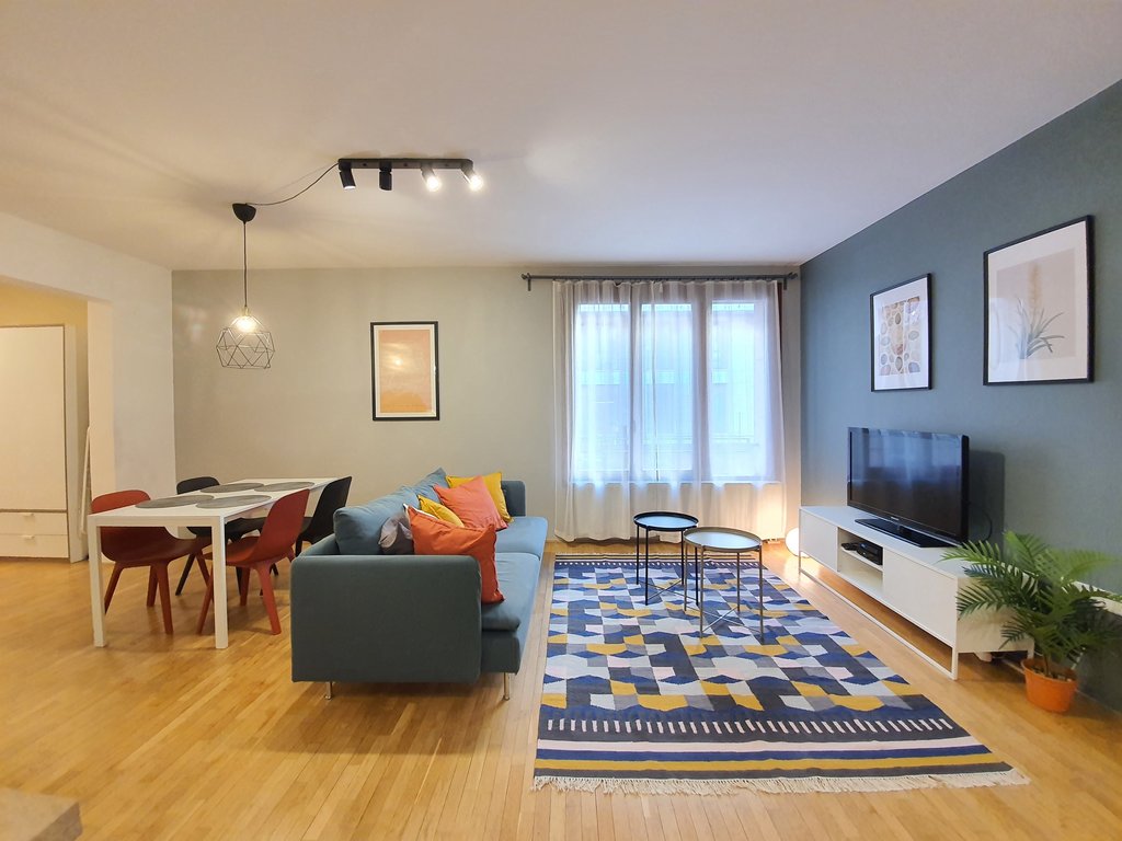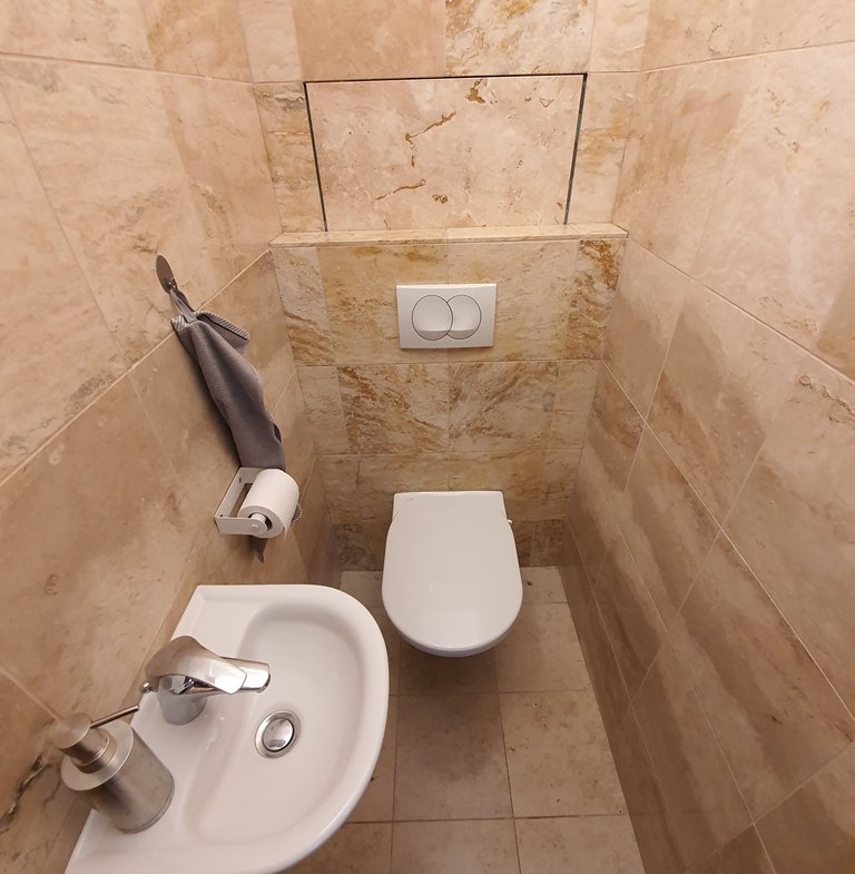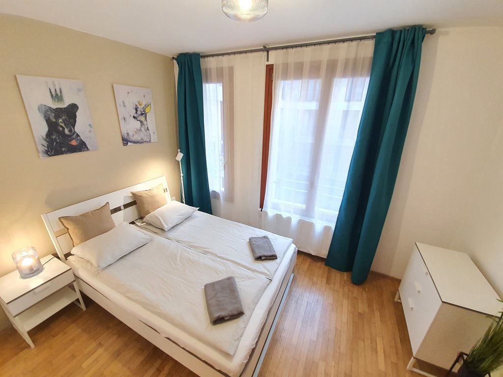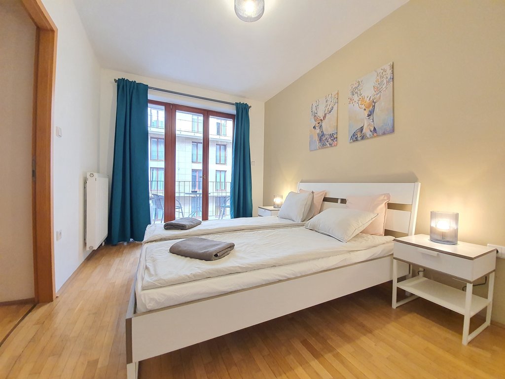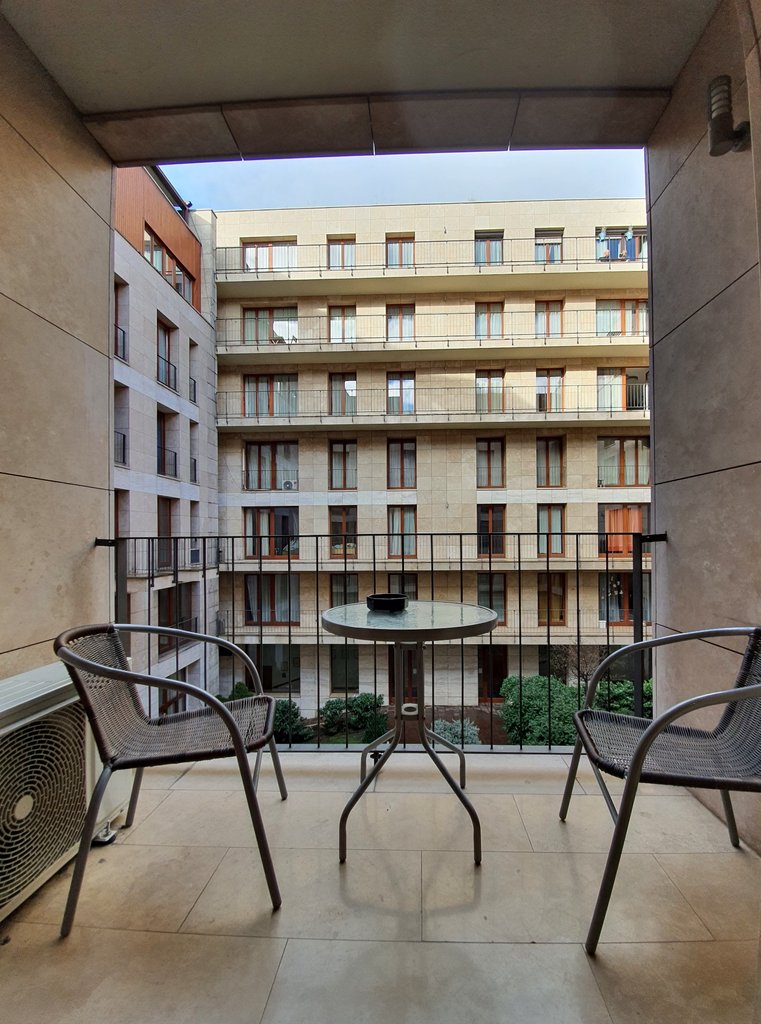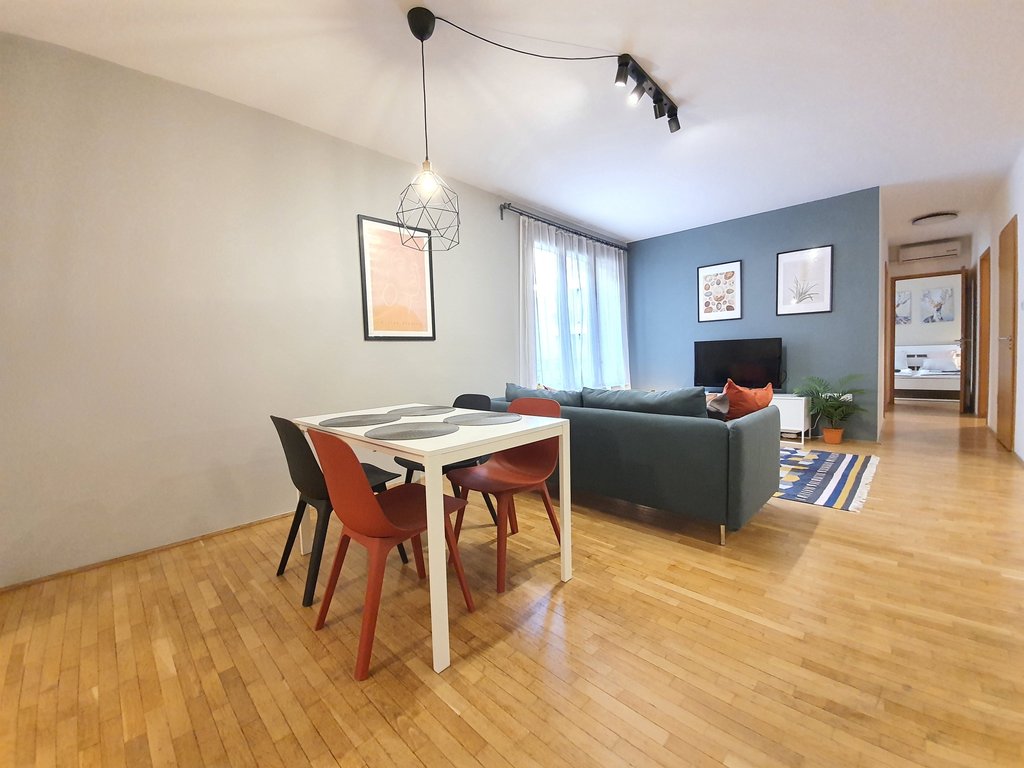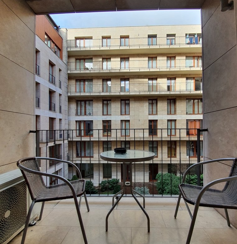A tastefully furnished 2-bedroom apartment is for rent in the city center. The 75 sqm apartment has 2 bedrooms, a living room with an American kitchen, a bathroom with a bathtub and a guest toilet. The bedrooms have a pleasant balcony overlooking the quiet inner courtyard. Extras: elevator, air conditioning, parking in the underground garage.