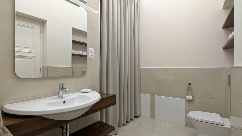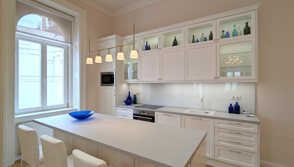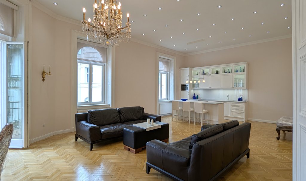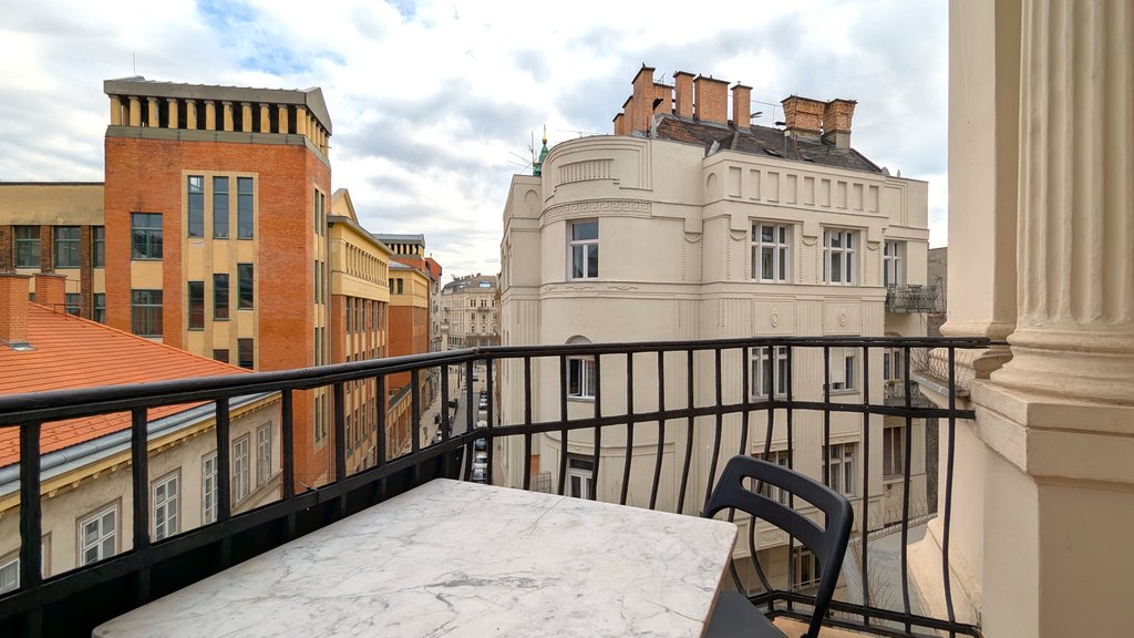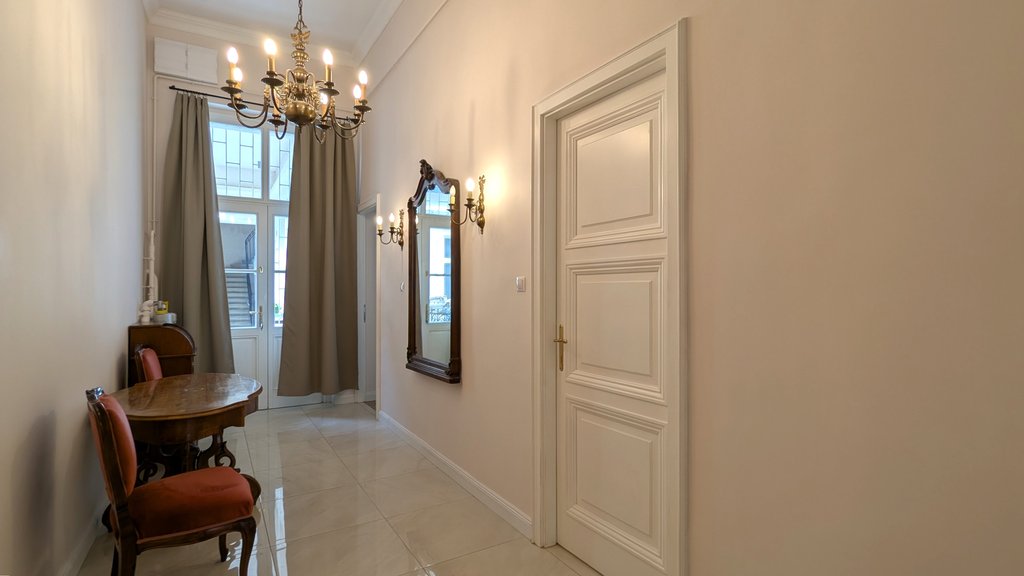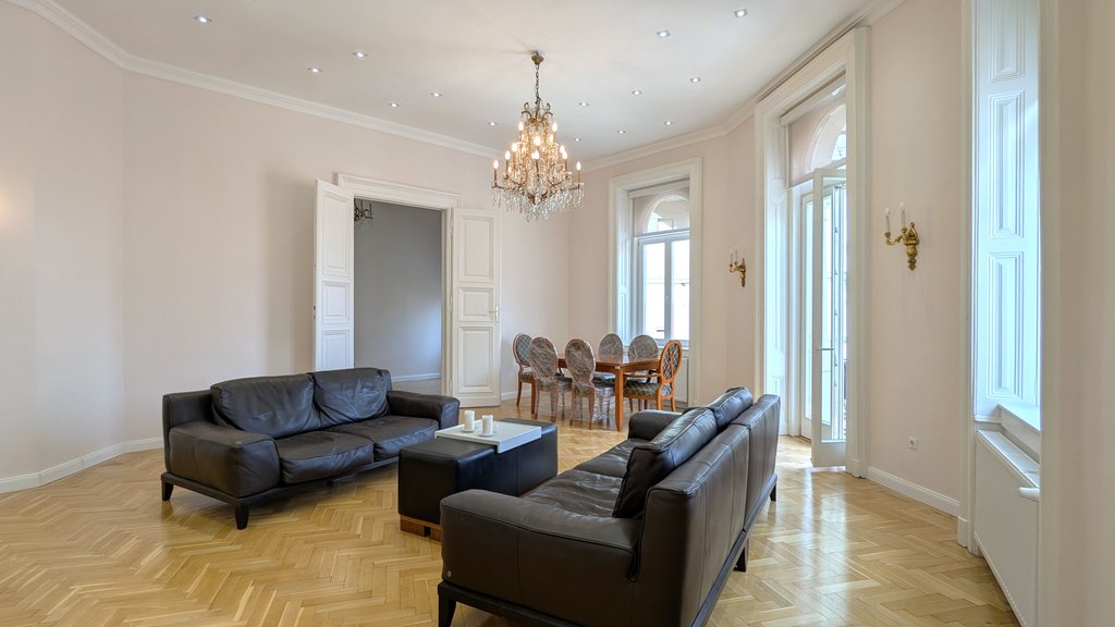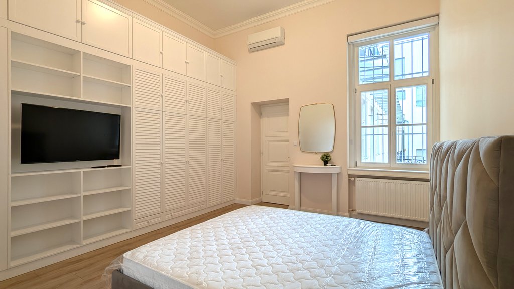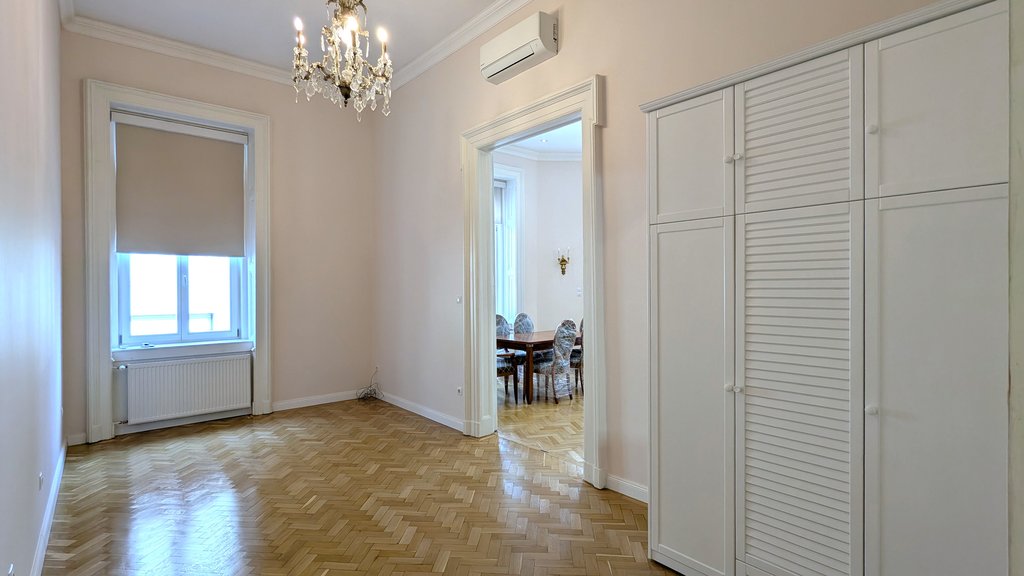 Recently renovated, spacious apartment is for rent in the heart of the 5th District, on a lovely oneway street. The flat is located on the 3rd floor, has 125 sqm and consitst of a bigger open plan kitchen with dining area and living room, 2 bedrooms, 2 bathrooms and a balcony. Available unfurnished or partially equipped. The buliding is in excellent condition with an elevator, the property is air-conditioned and alarm protected. The area offers sevaral cafes and restaurants, also the Great Market Hall is within walking distance.