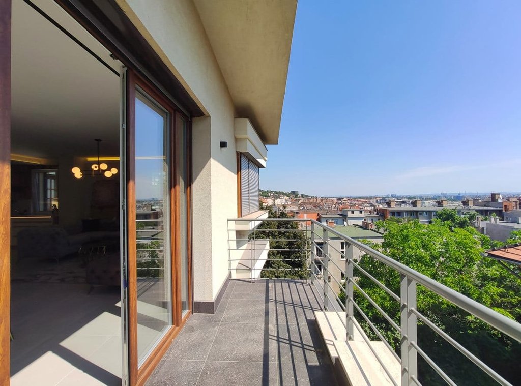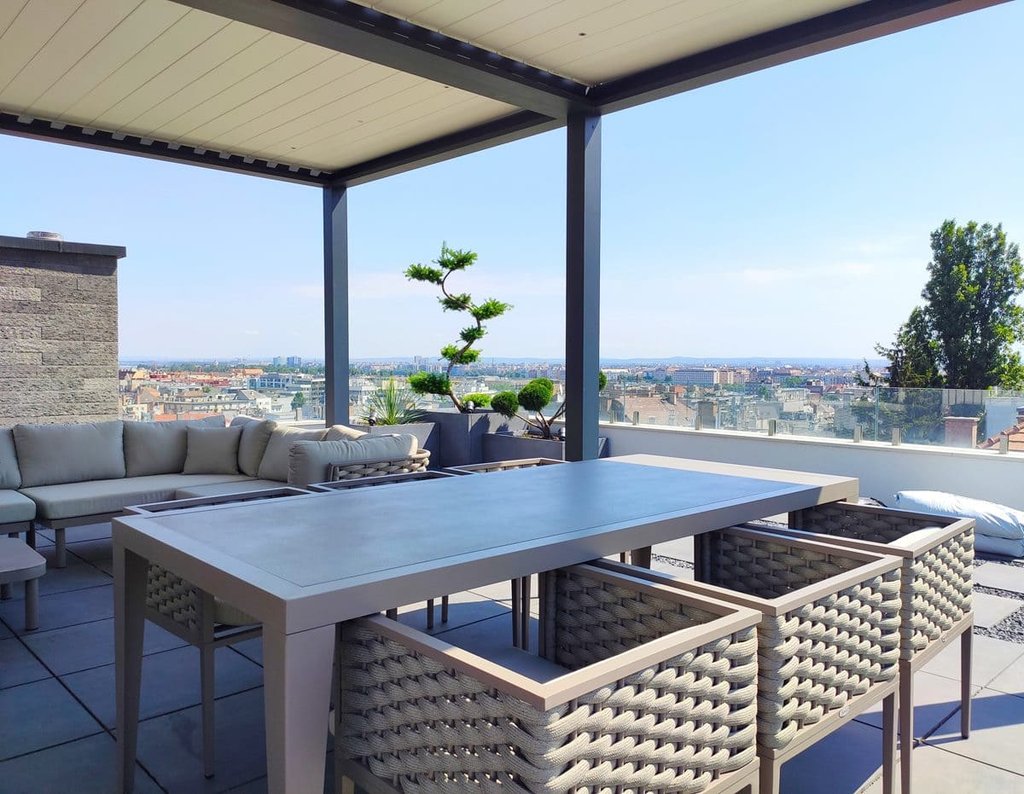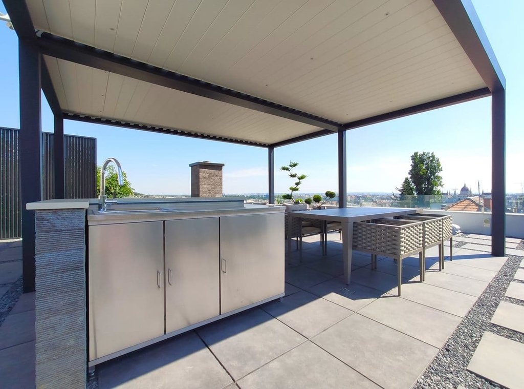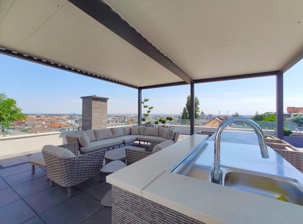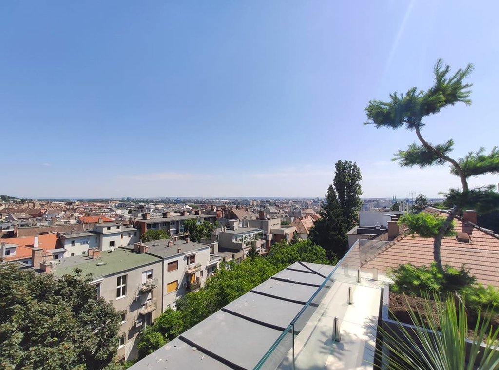Exclusive, stunning, modern, 2-storey sqm penthouse is for rent in the beautiful 1st district with amazing panoramic view. The 145 sqm property consists of an open-style kitchen with living room, two bedroom with en-suite bathrooms, a study and a guest toilet. The rooftop terrace has a Jacuzzi, outdoor kitchen, a shower and a sauna. Extras: AC, electrical shutter, alarm system, washing machine and a dryer. Two cars can park in the underground garage. Mammut Shopping Centre can be reached within 5 minutes on foot. Metro, bus and trams stops can be found nearby.