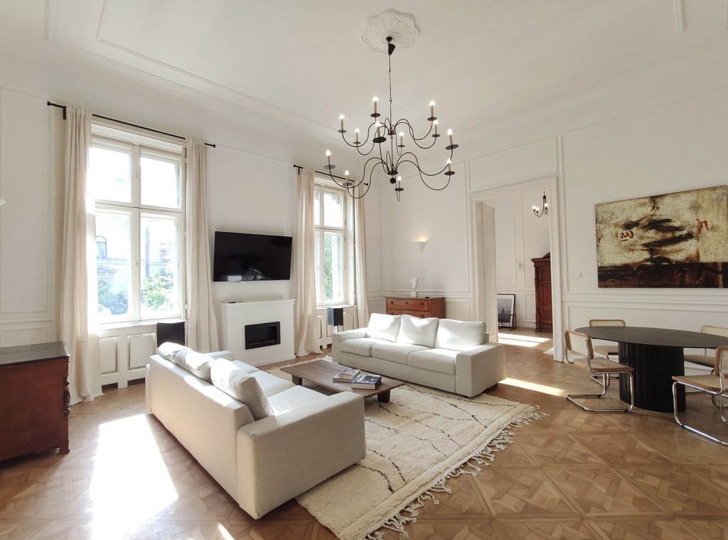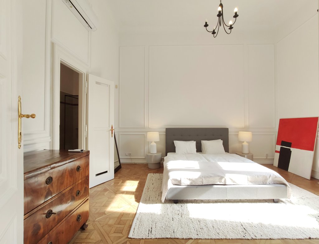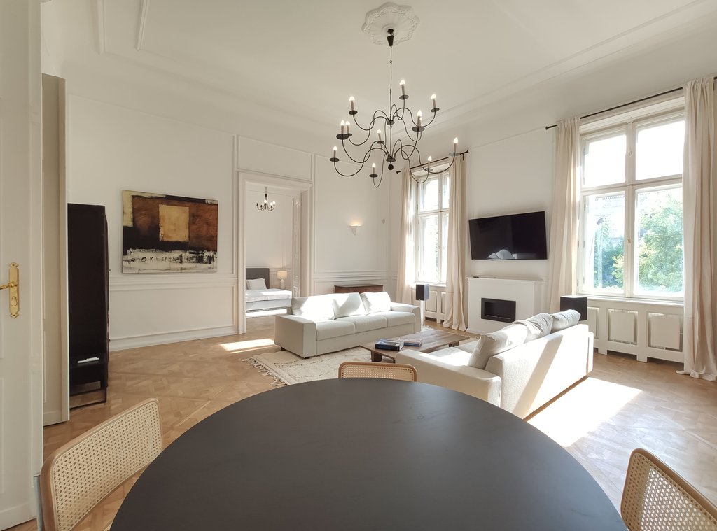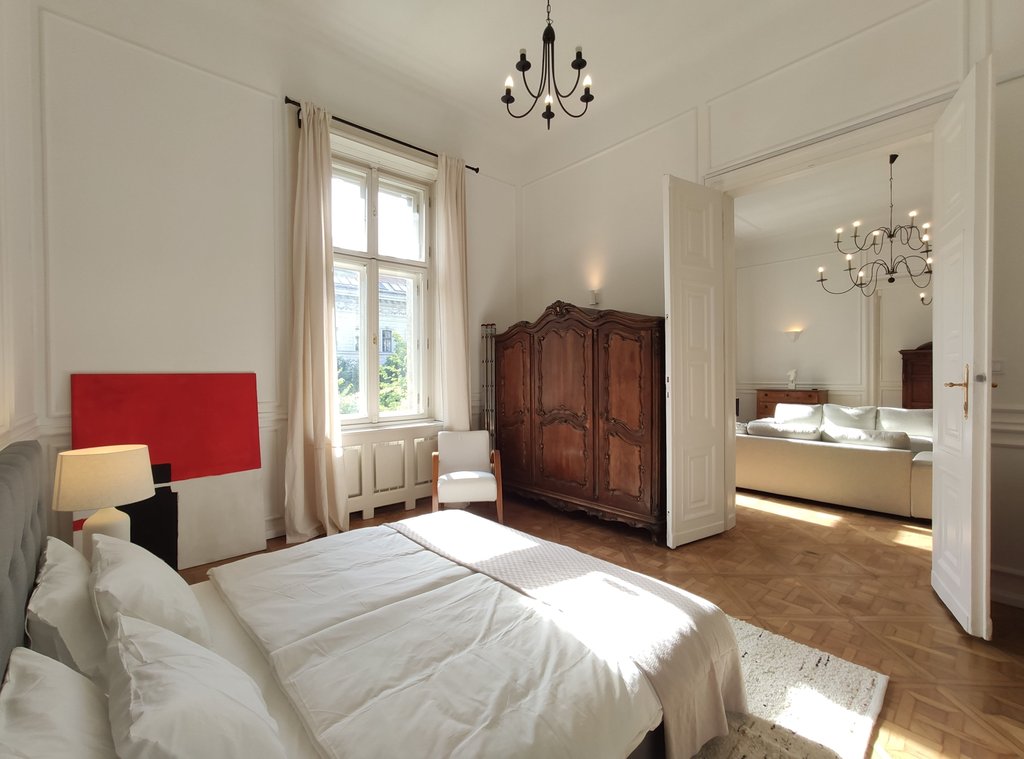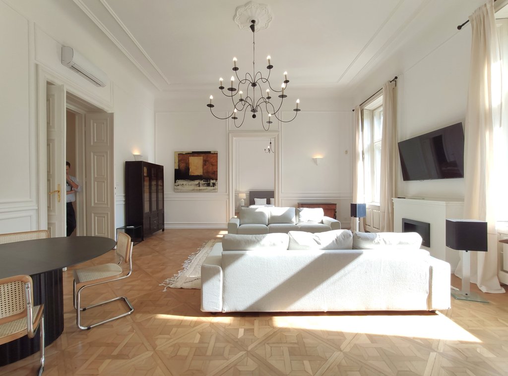 In the heart of the 6th district, on the historical Andrássy Avenue, an elegant, Parisian-style apartment with beautiful original wooden floor parquett from the Opera house is for rent. The 127 sqm property consists of two big bedrooms, a spacious living room, a separate kitchen, and two bathrooms (one with a shower and a bathtub, the other has shower). The property is air-conditioned, the building has an elevator. In the courtyard there is a parking lot available for a car on a first come, first served basis. We recommend this property who prefers to live in a prestigious part of the city with access to high-end shops, cafés and restaurant.As a gift from the owner the tenant will receive free tickets to the premier shows of the Opera house in Andrássy Avenue.