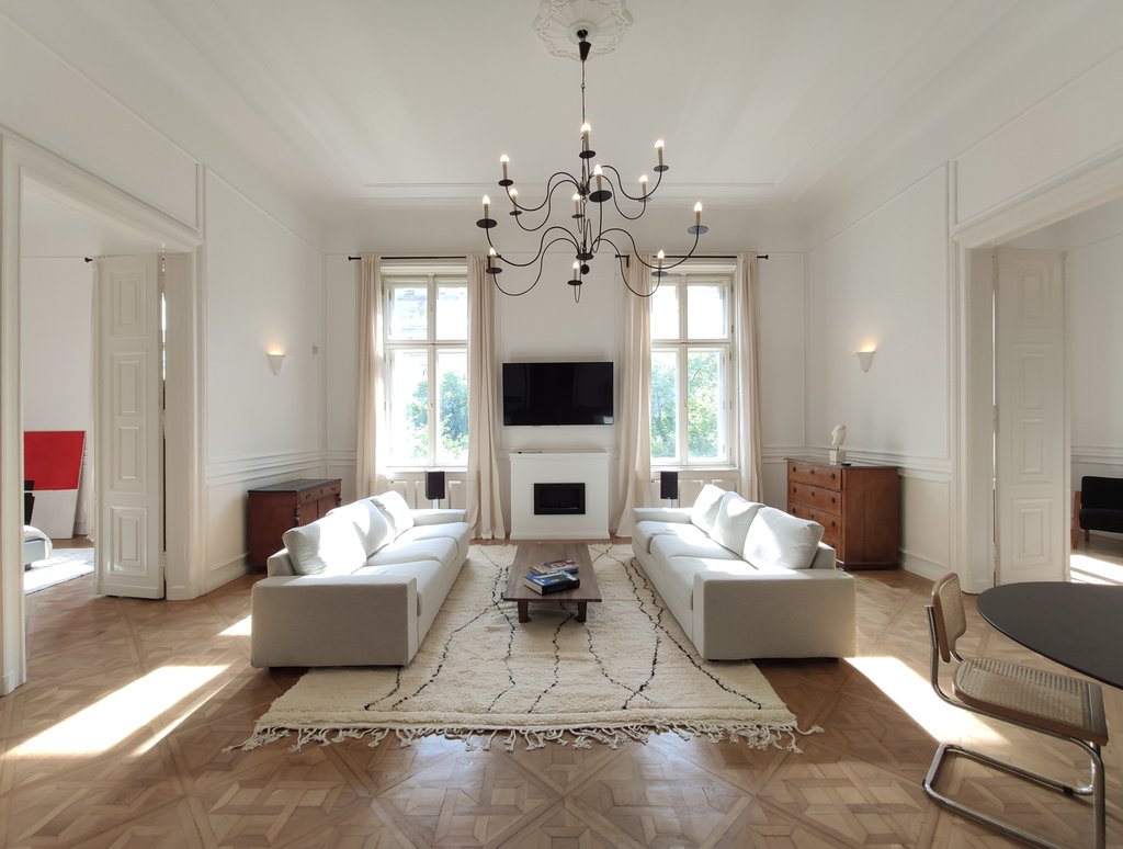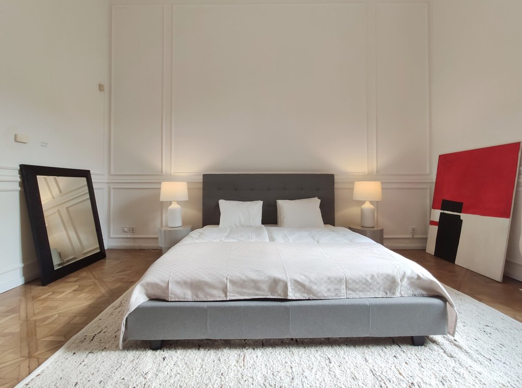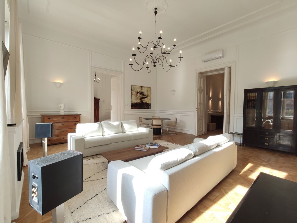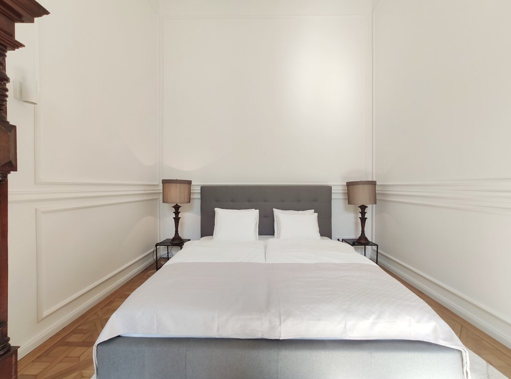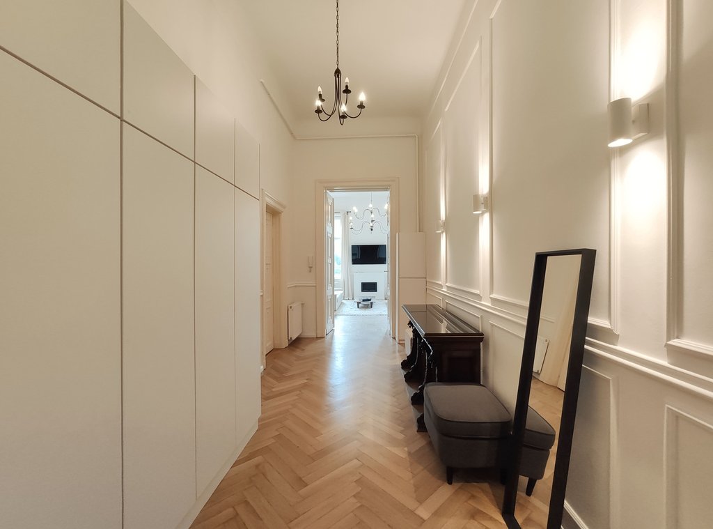 In the heart of the 6th district, on the historical Andrássy Avenue, an elegant, Parisian-style apartment with beautiful original wooden floor parquett from the Opera house is for rent. The 127 sqm property consists of two big bedrooms, a spacious living room, a separate kitchen, and two bathrooms (one with a shower and a bathtub, the other has shower). The property is air-conditioned, the building has an elevator. In the courtyard there is a parking lot available for a car on a first come, first served basis. We recommend this property who prefers to live in a prestigious part of the city with access to high-end shops, cafés and restaurant.As a gift from the owner the tenant will receive free tickets to the premier shows of the Opera house in Andrássy Avenue.
