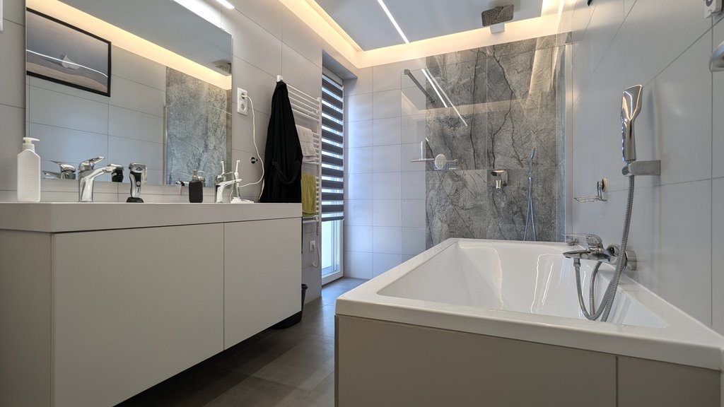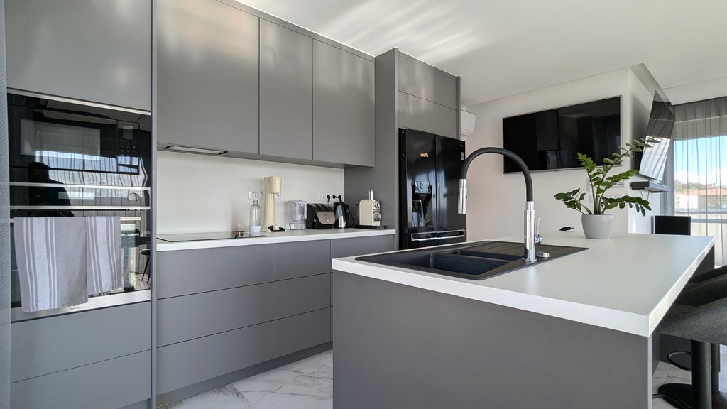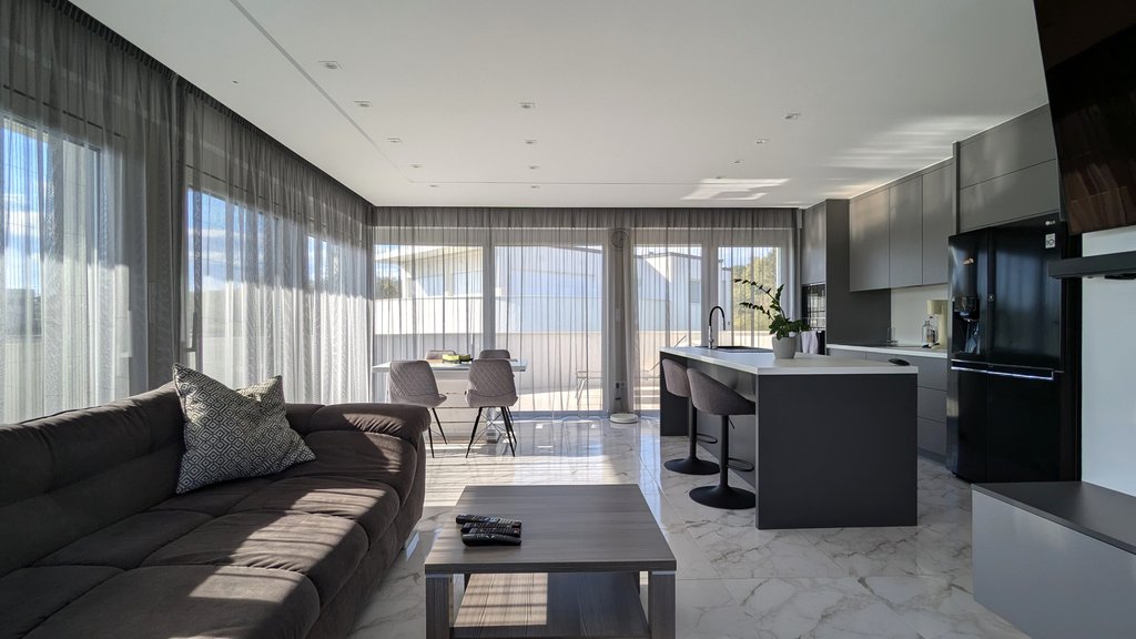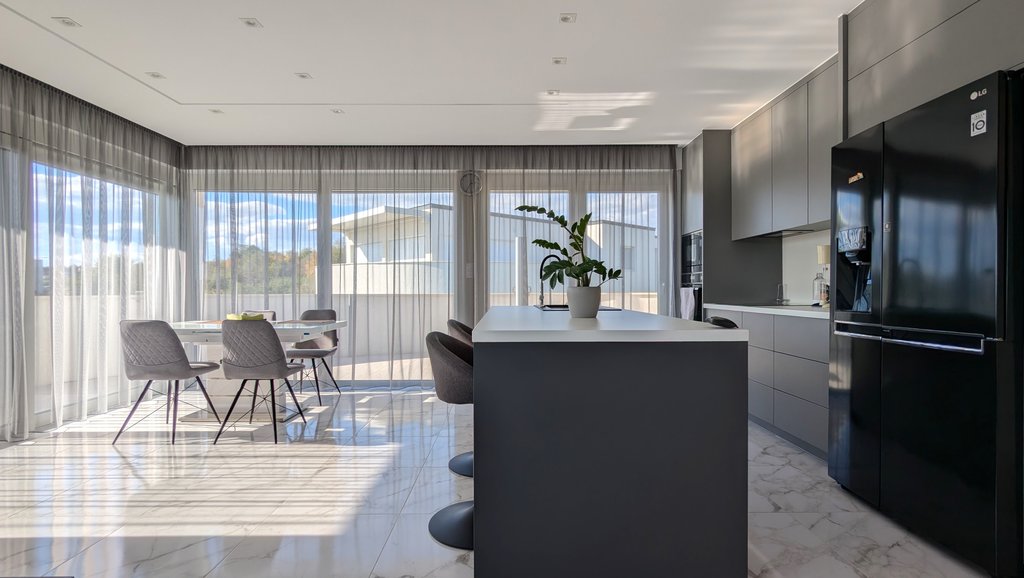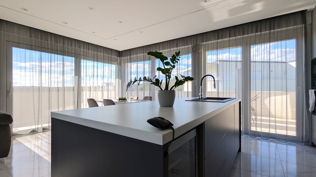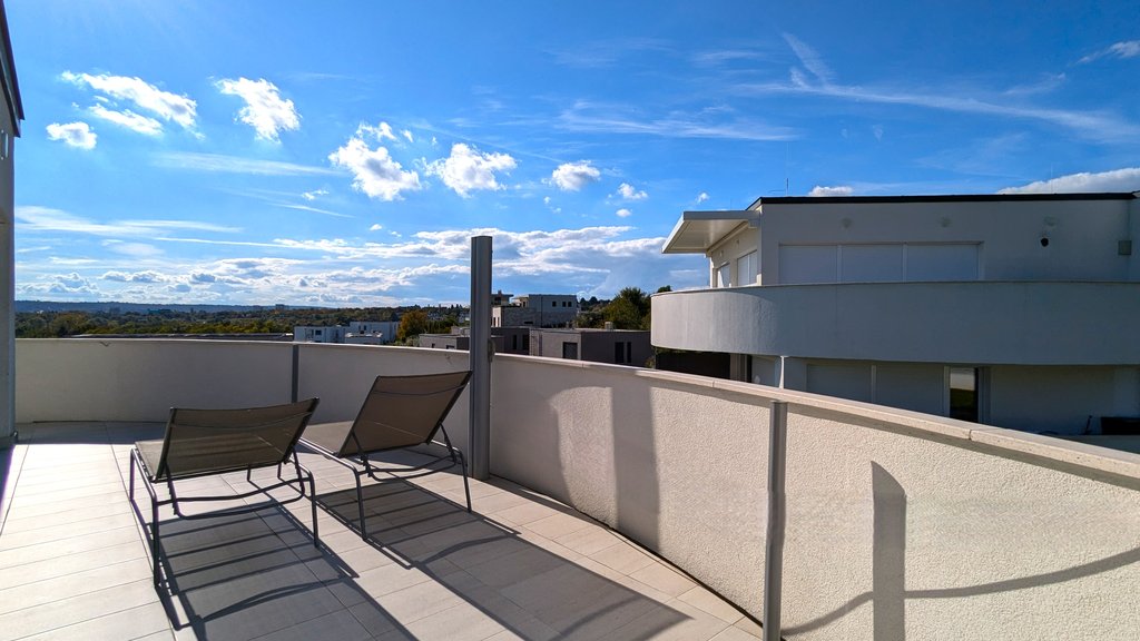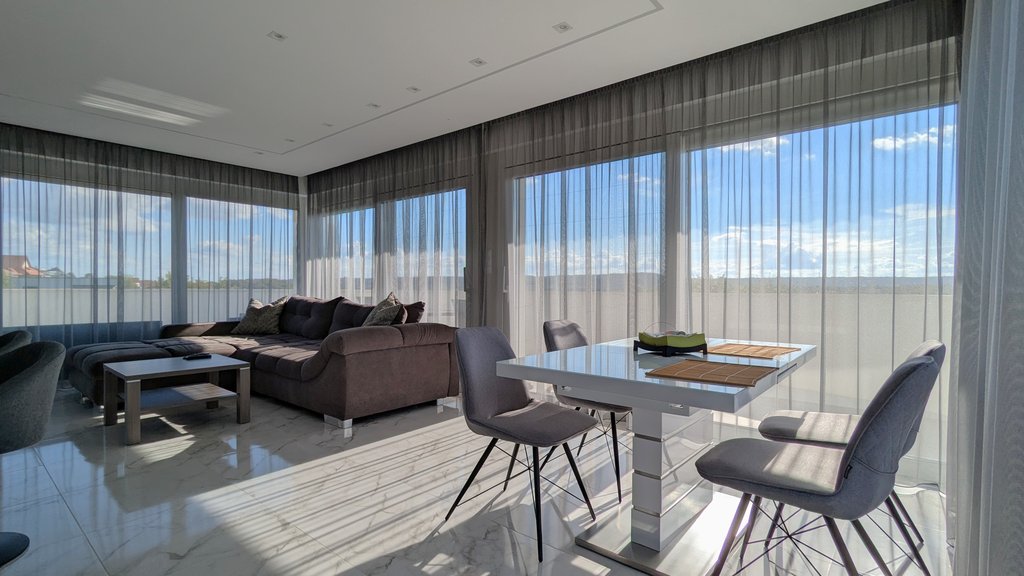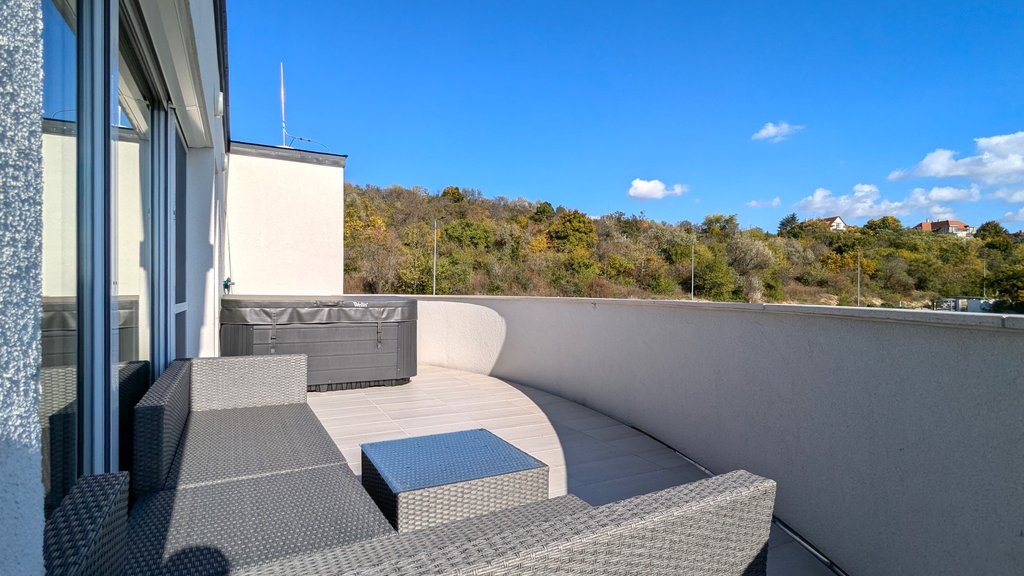 We offer a 95 sqm, newly built, 2nd floor Penthouse apartment for long term rent in Madárhegy. The fully furnished and equipped property consists of a living room with an open-plan kitchen, 3 bedrooms, a bathroom with a bathtub and a shower, a bathroom with a shower and a guest toilet. The huge 65 sqm terrace with jacuzzi and breathtaking panoramic view is accessible from the living room, the bathroom and one of the bedrooms. For the convenience of the residents, there is a separate laundry room with washing and drying machines, a spacious storage room on the ground floor and a two-space courtyard parking space with the possibility to charge electric cars. There is a playground for children in the beautiful common use garden. This property is an ideal choice for those who want to live away from the noise of the city, but still within a 15-20 minute drive from the center. Bus stops a few hundred meters away, M1 and M7 highways a few minutes’ drive away.