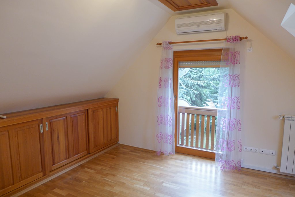 4 szintes családi ház kiadó a II/a kerületben, Budaligeten a Francia iskola szomszédságában. A bejárati szinten van a kandallós nappali a tágas terasszal, a jól felszerelt, félig zárt konyha, az előszoba nagy beépített szekrényekkel és egy vendég mosdó. A következő szinten a szülői hálószoba saját gardróbbal, egy dolgozónak kialakított tágas szoba és egy pici vendégszoba található, valamint egy masszázskádas fürdőszoba dupla mosdóval. A legfelső szinten 2 légkondicionált hálószoba kapott helyet, 2 zuhanyzós fürdőszobával. A garázs szinten 2 autónak van parkolási lehetőség, itt van egy fitness helyiség, egy szauna, gőzkabinos zuhanyzó, egy WC, egy nagyméretű mosókonyha számos beépített szekrénnyel és egy kamra szintén sok pakolási lehetőséggel. A garázslejáró fűthető. A ház összes ablakán elektromos redőny van, a nappali szinten padló és falfűtés van, riasztó rendelkezésre áll. A ház kertjében hangulatos kerti tó van.