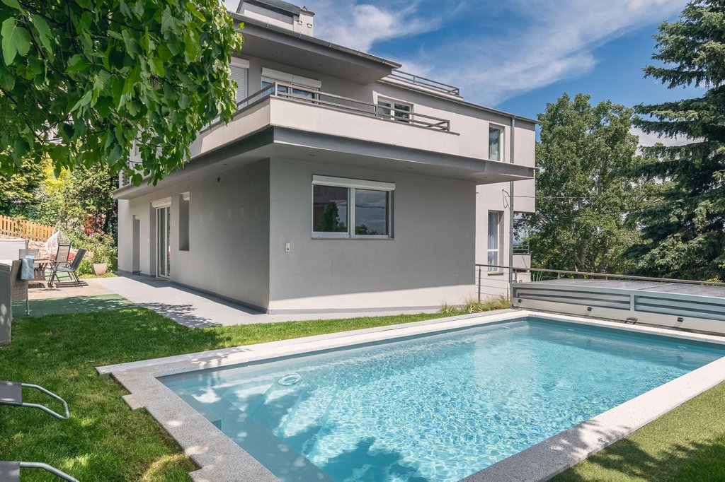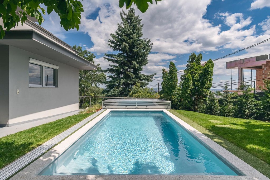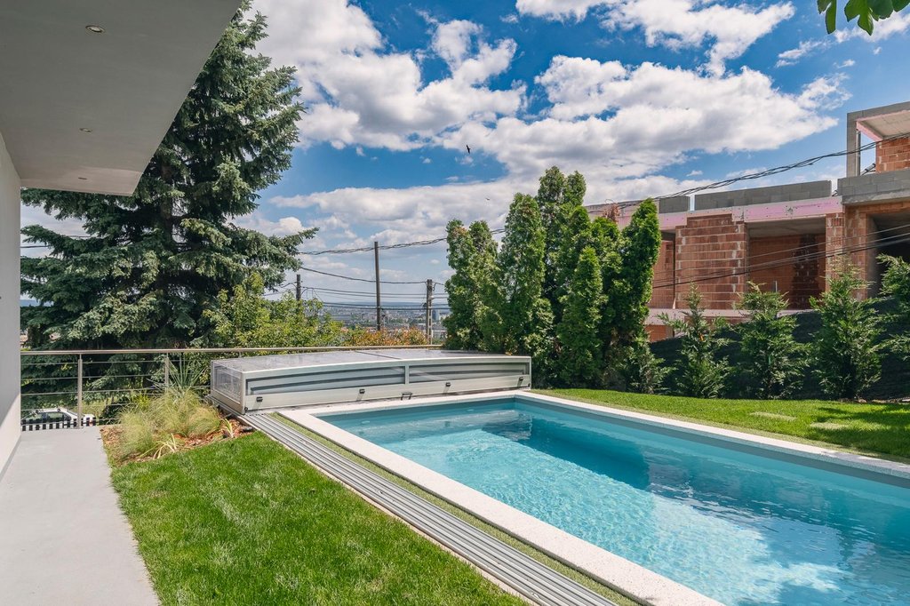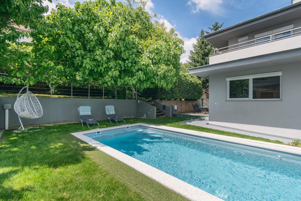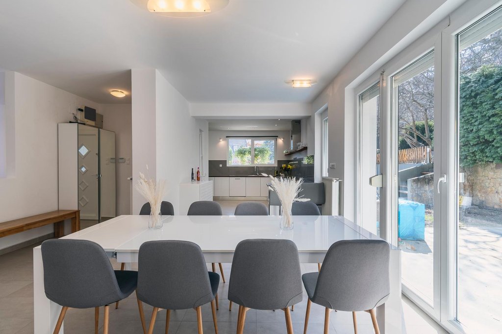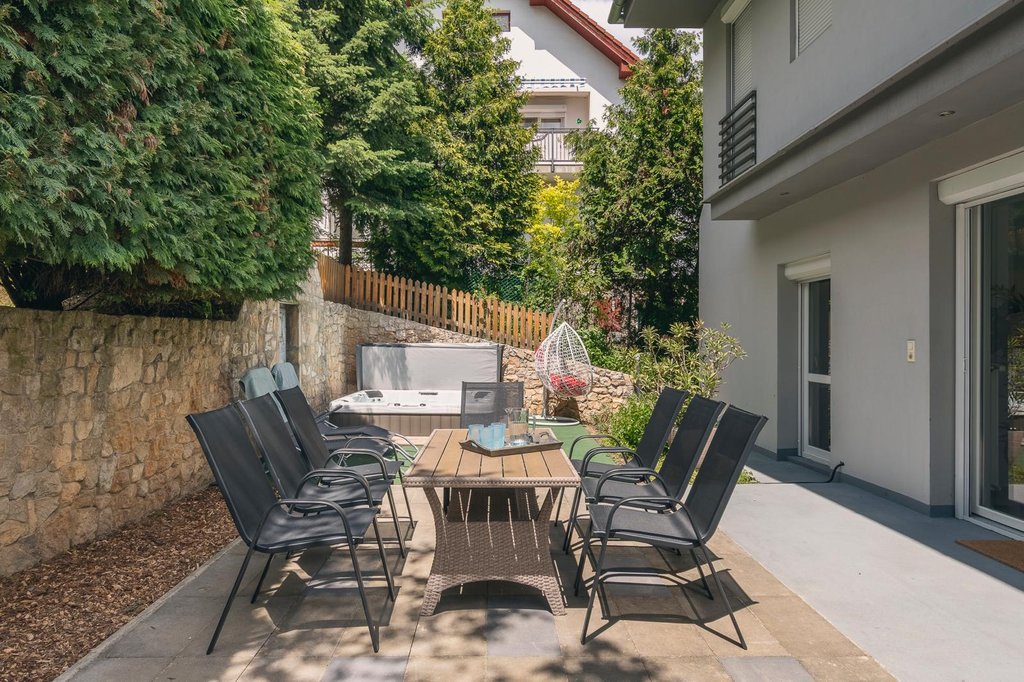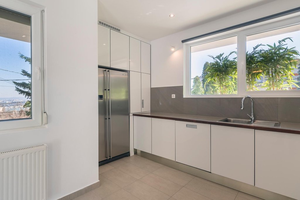 Near to the British International School, in beautiful green environment, a furnished detached house is for rent. The 3-storey property consists of a basement area and 2 living area levels. The alarm protected house is unfurnished but there are several built in wardrobes. All together 5 bedrooms, 4 bathrooms and a well-equipped open plan kitchen ensures comfortable everyday life for the tenants. There is direct connection to the balconies from the living room and from some of the bedrooms. The garden is 1000 sqm large and offers great time for family and friends enjoying relaxing summer days. One indoor garage and further outside parking place for one car are also available. There is a laundry, a shower and several storage places in the basement area. On the ground floor level you can find a spacious living room, a dining room, an open plan kitchen and a guest toilet, a nice children living room and a separated bedroom (can be used as master bedroom) with en-suite bathroom. The top floor includes 4 bedrooms and two bathrooms. Pets are welcome!