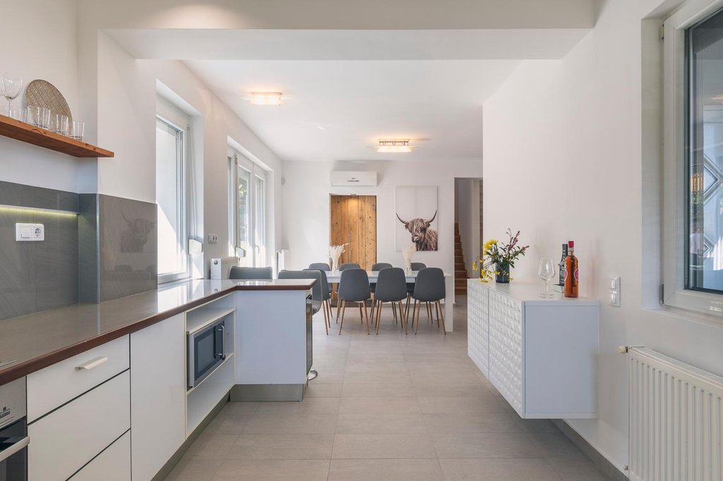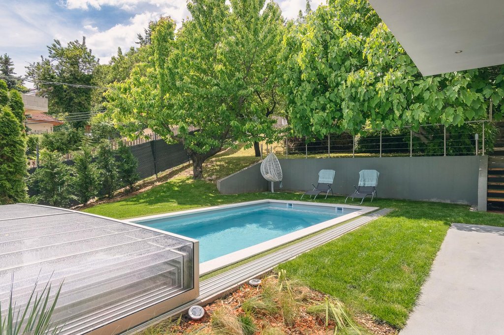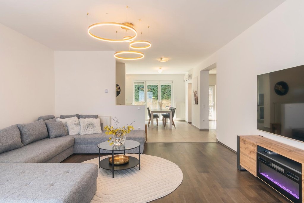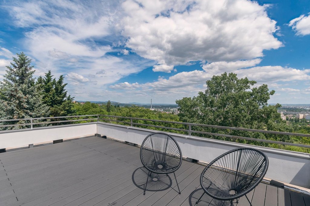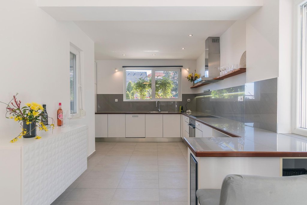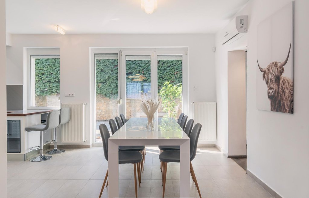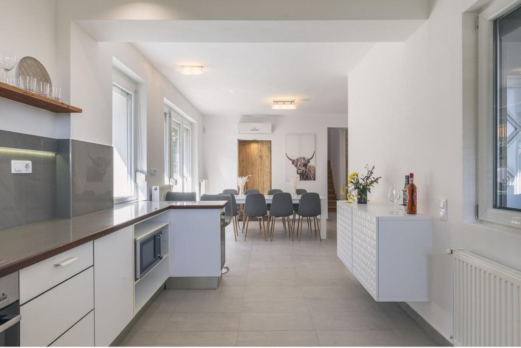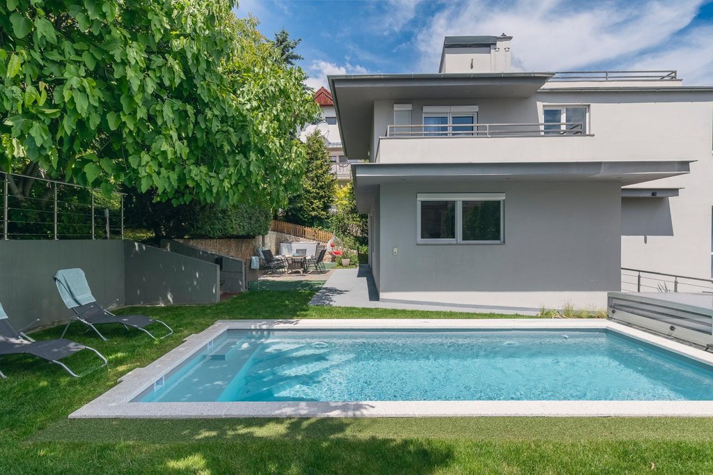Near to the British International School, in beautiful green environment, a furnished detached house is for rent. The 3-storey property consists of a basement area and 2 living area levels. The alarm protected house is unfurnished but there are several built in wardrobes. All together 5 bedrooms, 4 bathrooms and a well-equipped open plan kitchen ensures comfortable everyday life for the tenants. There is direct connection to the balconies from the living room and from some of the bedrooms. The garden is 1000 sqm large and offers great time for family and friends enjoying relaxing summer days. One indoor garage and further outside parking place for one car are also available. There is a laundry, a shower and several storage places in the basement area. On the ground floor level you can find a spacious living room, a dining room, an open plan kitchen and a guest toilet, a nice children living room and a separated bedroom (can be used as master bedroom) with en-suite bathroom. The top floor includes 4 bedrooms and two bathrooms. Pets are welcome!