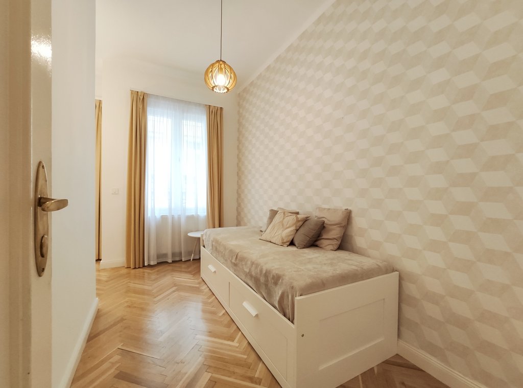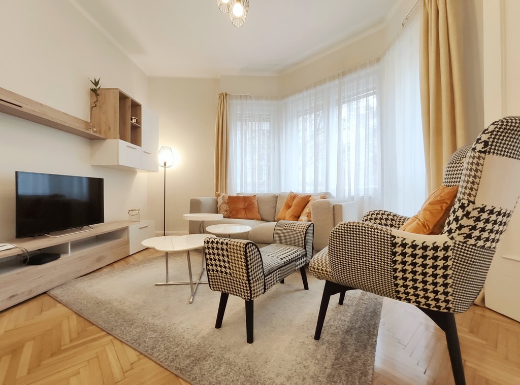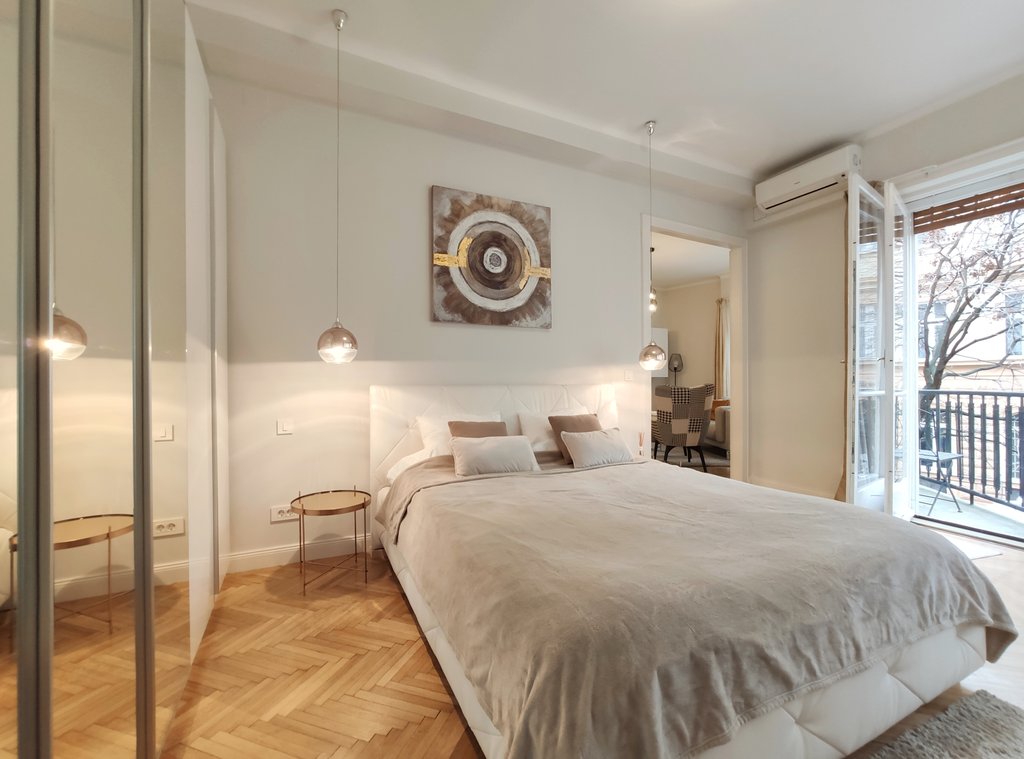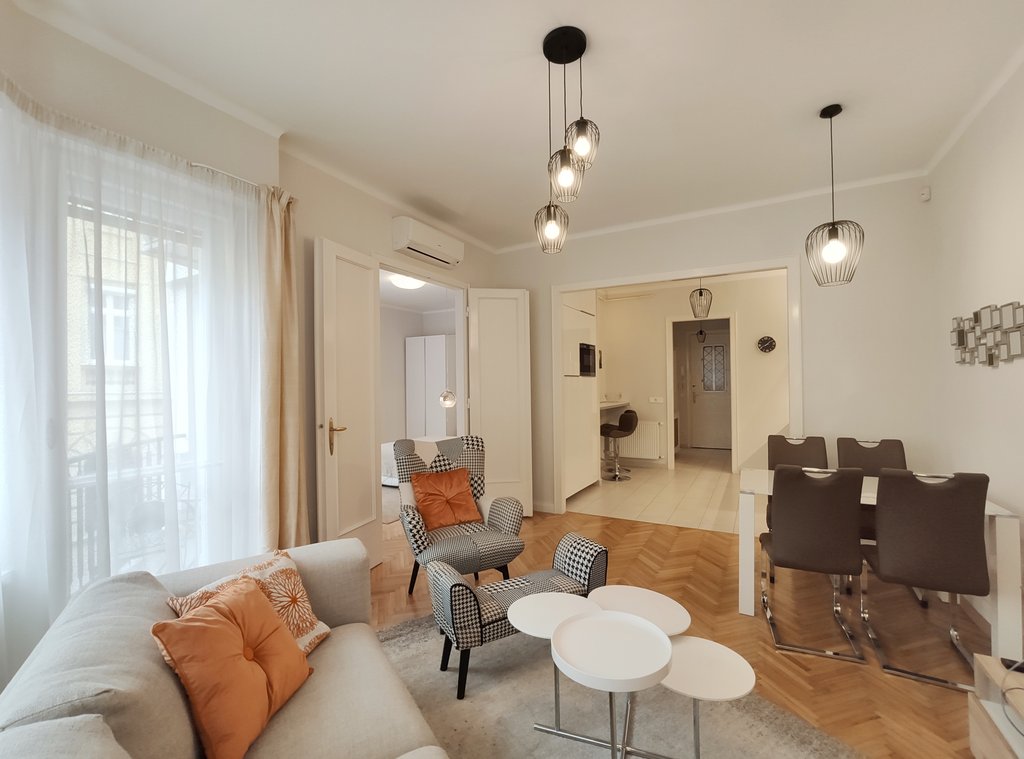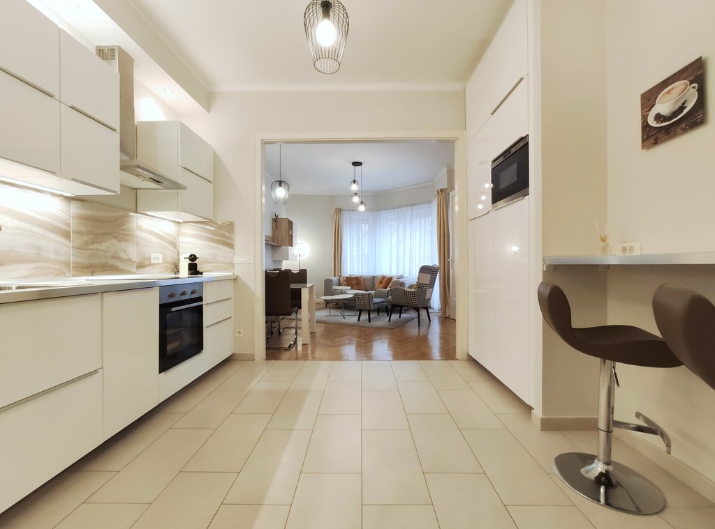 Budapest pezsgő belvárosában, az Opera Ház mögött a Hajós utcában kiadó egy újonnan 2016-ban felújított, liftes ház emeleti, légkondicionált és riasztóval felszerelt teraszos lakása. A 66 m2-es autentikus, igényes bútorokkal bebútorozott ingatlanban tágas nappali, két hálószoba, fürdőkádas fürdőszoba, részben leválasztott konyha, étkező, gardrób valamint egy vendégmosdó került kialakításra. A hangulatos otthon ablakai a Hajós utcára néznek. A környék számos vásárlási és szórakozási lehetőséget kínál, neves divatházak üzletei, szépségszalonok, éttermek, kávézók is néhány perc alatt elérhetőek. Parkolás az utcán lehetséges, illetve a közelben őrzött parkolóházban garázs bérelhető. A tömegközlekedési lehetőségek kiválóak a környéken: Metro, villamos, buszmegállók pár lépésnyire találhatóak.