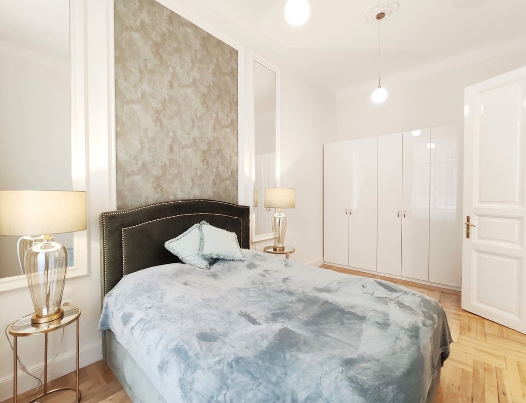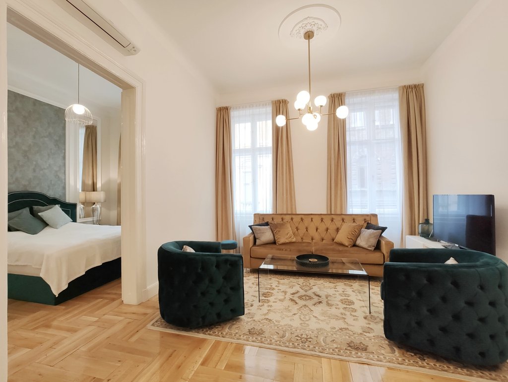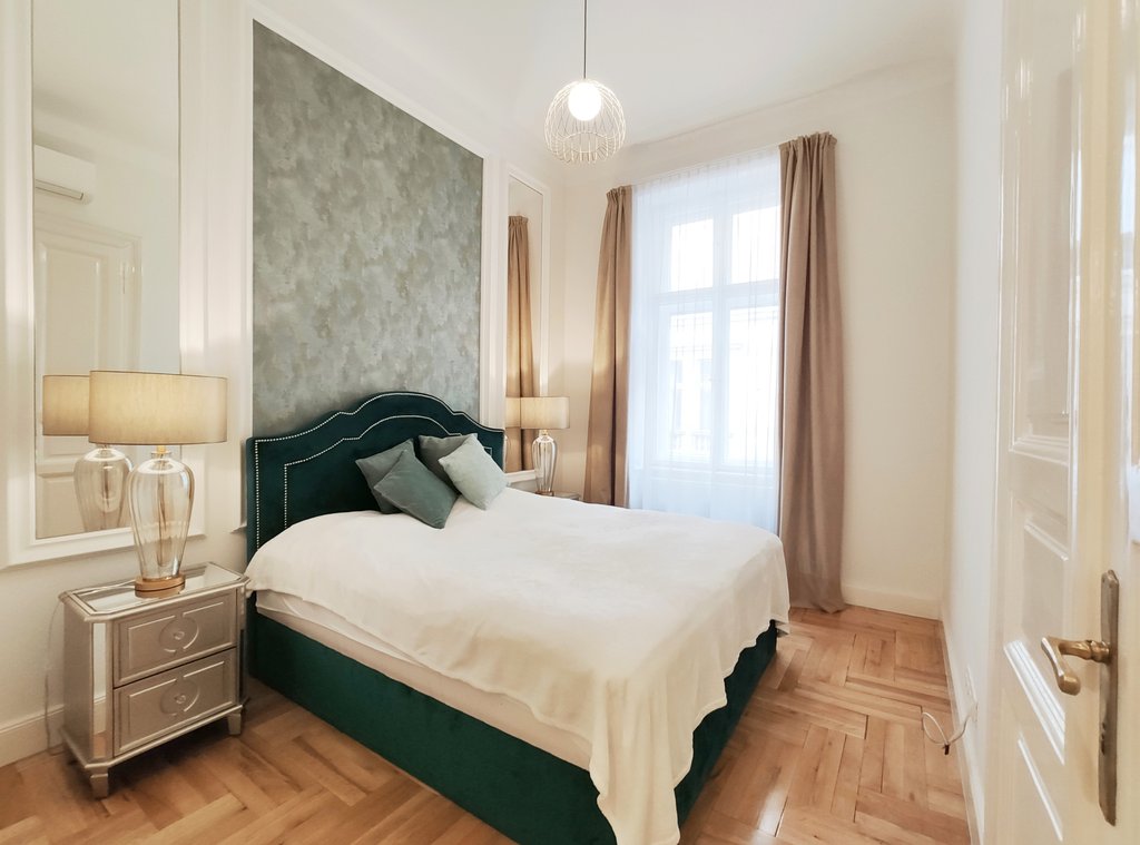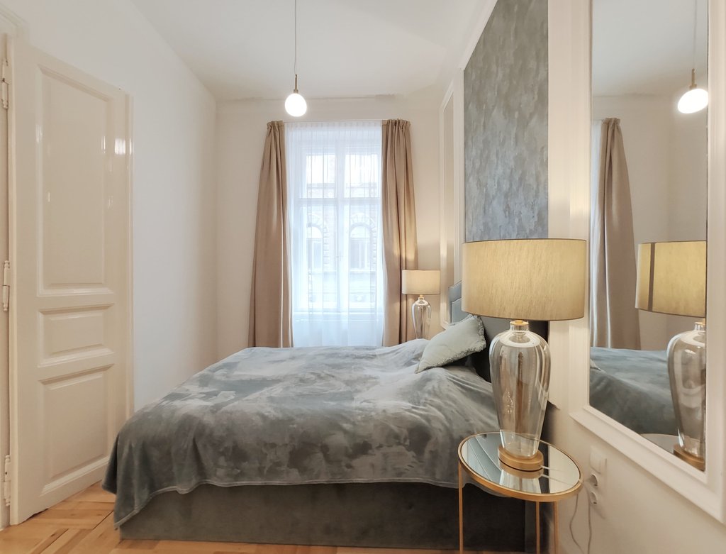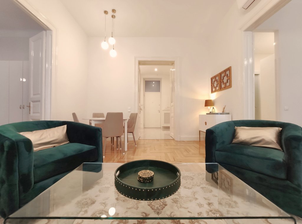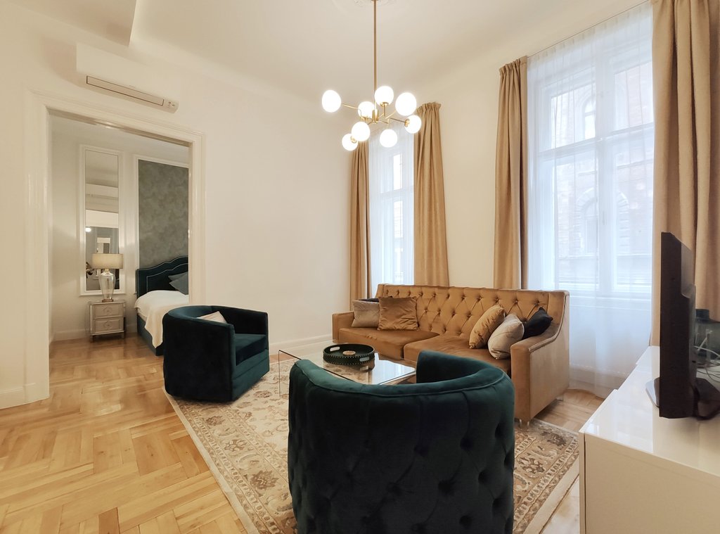 Frissen felújított, elegáns teljesen bútorozott utcai nézetű lakás kiadó a belváros szívében, az Opera mögött a VI. kerületben. Az első emeleti impozáns lakás 90nm-én kialakításra került egy teljesen felszerelt modern konyha reggelizőpulttal, nappali étkezővel, szülői hálószoba melynek saját gardróbja és fürdőszobája van. További helyiségek még a 2 hálószoba, és egy 1 kádas fürdőszoba. Az ingatlan légkondicionált és riasztóberendezéssel védett. A környék számos vásárlási és szórakozási lehetőséget kínál, neves divatházak üzletei, szépségszalonok, éttermek, kávézók is néhány perc alatt elérhetőek. Parkolás az utcán lehetséges, illetve a közelben őrzött parkolóházban garázs bérelhető. A tömegközlekedési lehetőségek kiválóak a környéken: Metro, villamos, buszmegállók pár lépésnyire találhatóak. Ideális otthont nyújthat pároknak, üzletembereknek, illetve mindazoknak, akik kedvelik a belvárosi nyüzsgést.