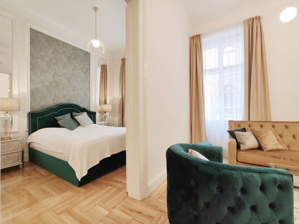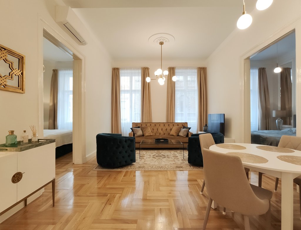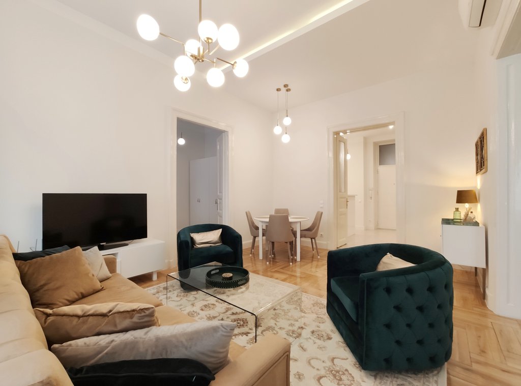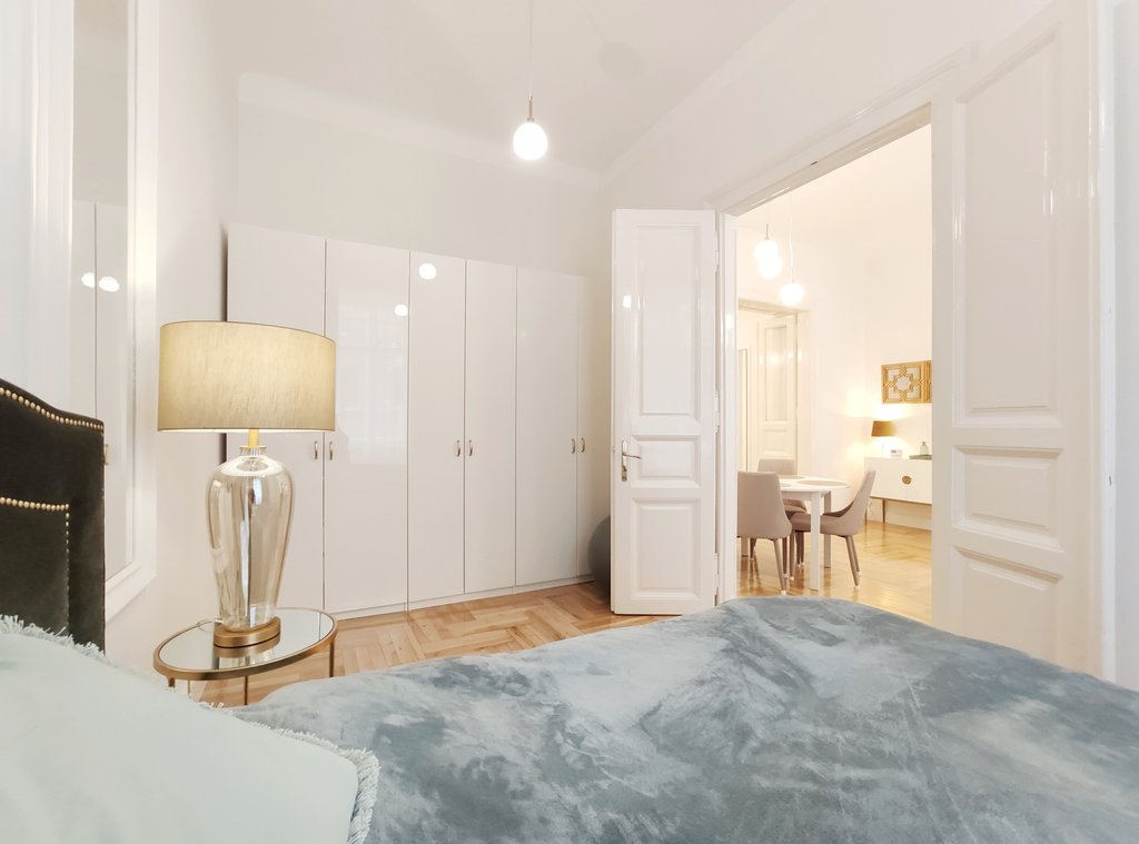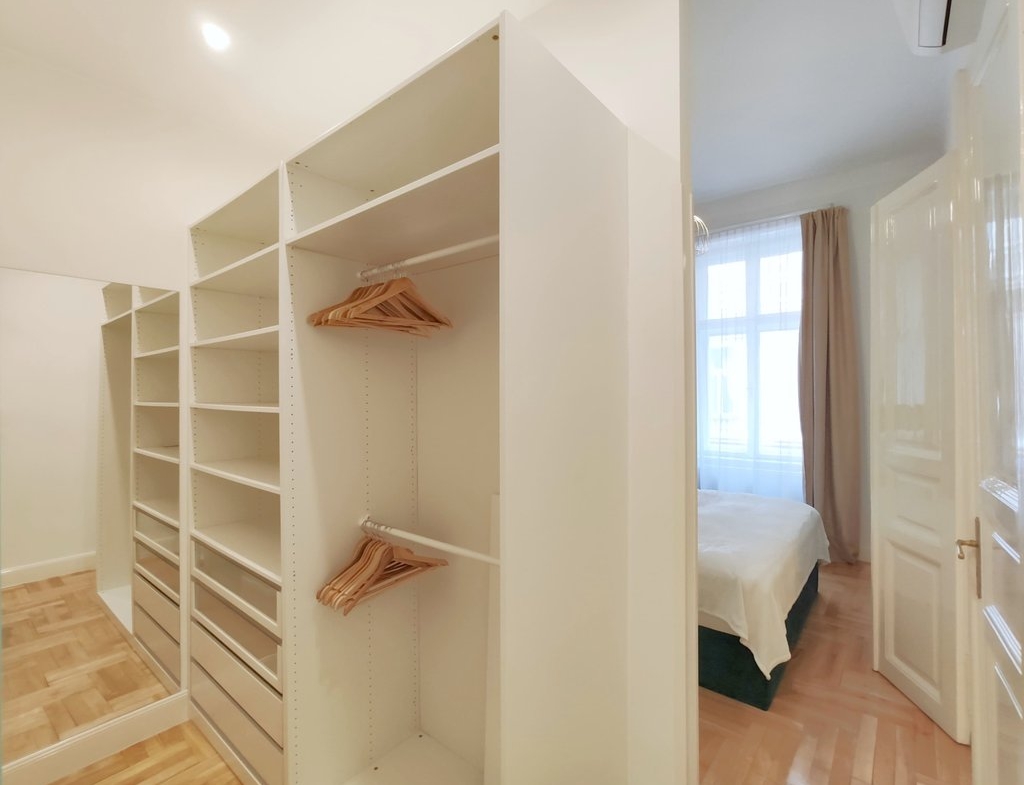 Frissen felújított, elegáns teljesen bútorozott utcai nézetű lakás kiadó a belváros szívében, az Opera mögött a VI. kerületben. Az első emeleti impozáns lakás 90nm-én kialakításra került egy teljesen felszerelt modern konyha reggelizőpulttal, nappali étkezővel, szülői hálószoba melynek saját gardróbja és fürdőszobája van. További helyiségek még a 2 hálószoba, és egy 1 kádas fürdőszoba. Az ingatlan légkondicionált és riasztóberendezéssel védett. A környék számos vásárlási és szórakozási lehetőséget kínál, neves divatházak üzletei, szépségszalonok, éttermek, kávézók is néhány perc alatt elérhetőek. Parkolás az utcán lehetséges, illetve a közelben őrzött parkolóházban garázs bérelhető. A tömegközlekedési lehetőségek kiválóak a környéken: Metro, villamos, buszmegállók pár lépésnyire találhatóak. Ideális otthont nyújthat pároknak, üzletembereknek, illetve mindazoknak, akik kedvelik a belvárosi nyüzsgést.