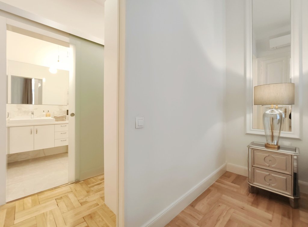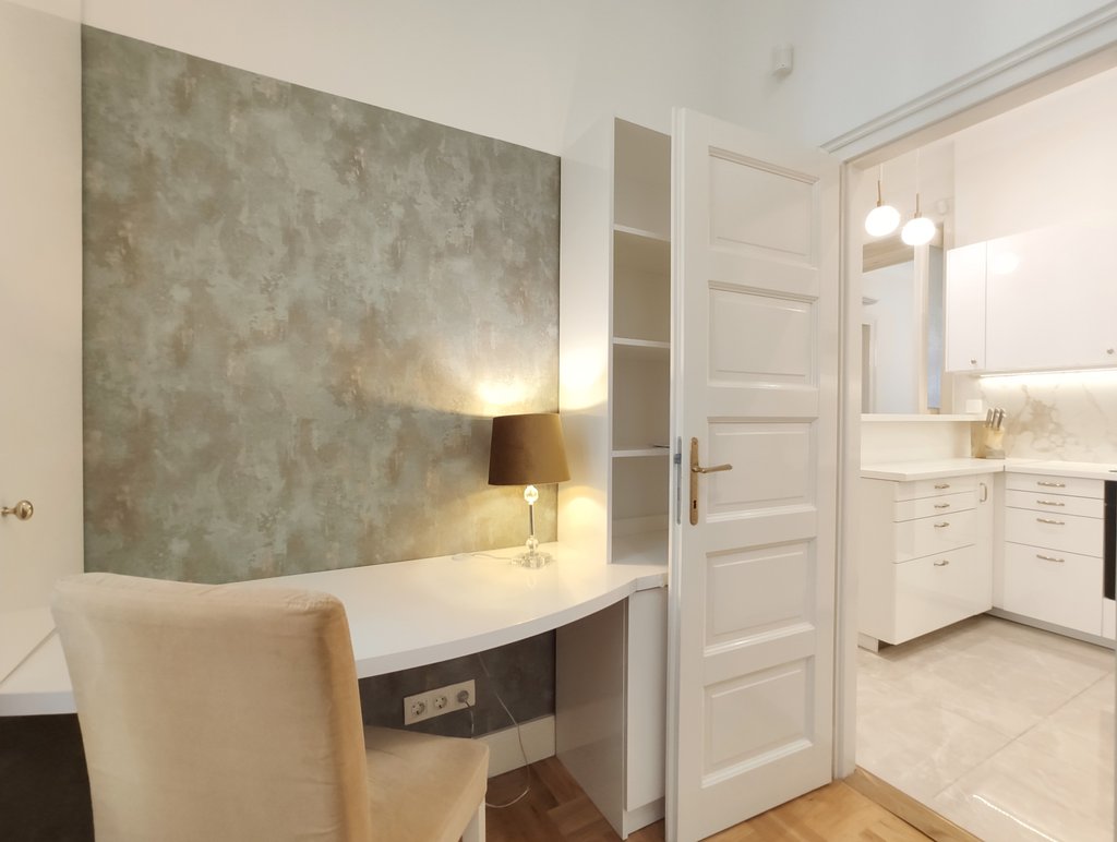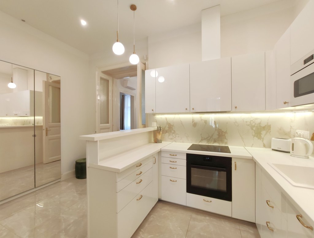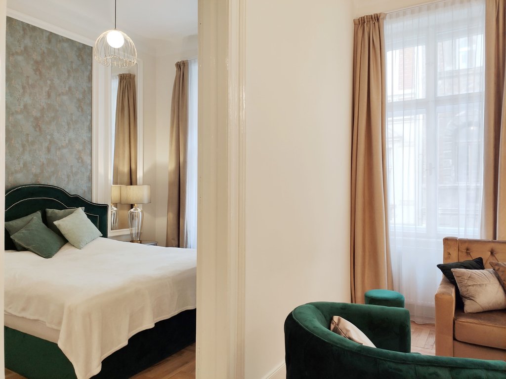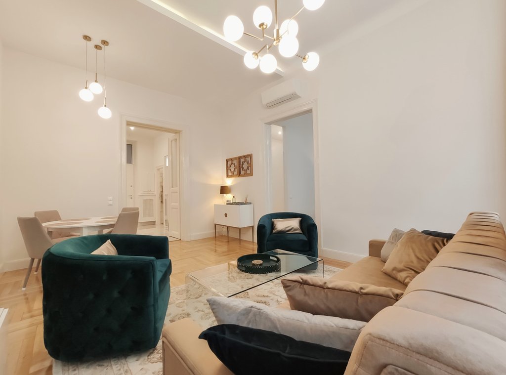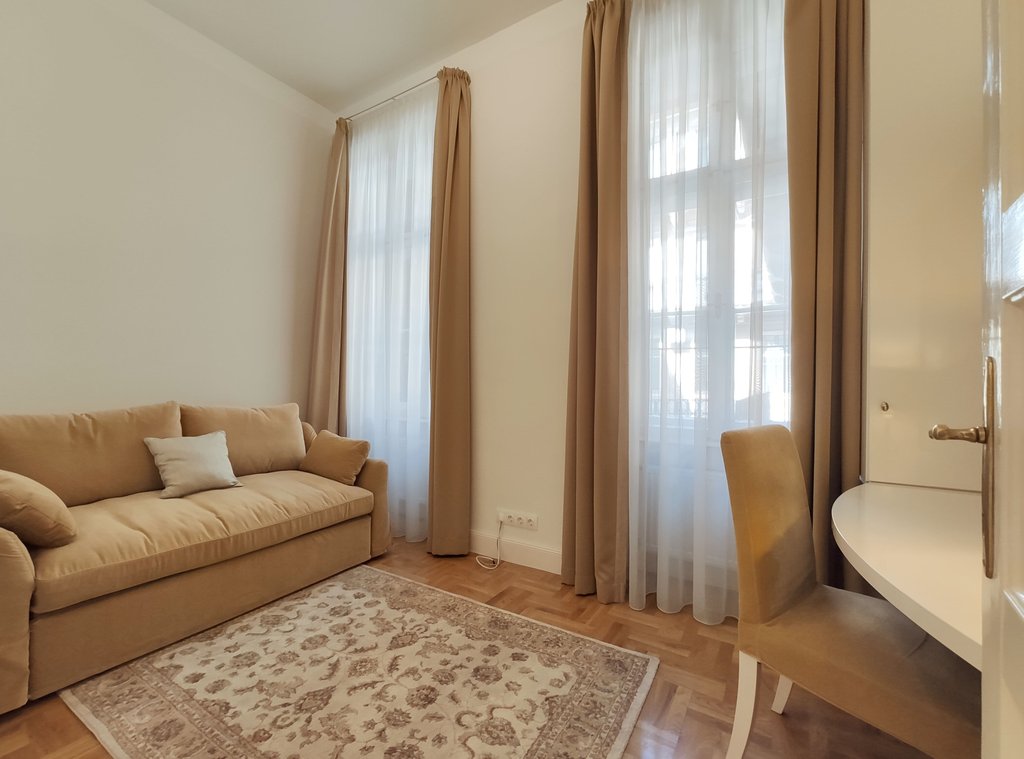 Frissen felújított, elegáns teljesen bútorozott utcai nézetű lakás kiadó a belváros szívében, az Opera mögött a VI. kerületben. Az első emeleti impozáns lakás 90nm-én kialakításra került egy teljesen felszerelt modern konyha reggelizőpulttal, nappali étkezővel, szülői hálószoba melynek saját gardróbja és fürdőszobája van. További helyiségek még a 2 hálószoba, és egy 1 kádas fürdőszoba. Az ingatlan légkondicionált és riasztóberendezéssel védett. A környék számos vásárlási és szórakozási lehetőséget kínál, neves divatházak üzletei, szépségszalonok, éttermek, kávézók is néhány perc alatt elérhetőek. Parkolás az utcán lehetséges, illetve a közelben őrzött parkolóházban garázs bérelhető. A tömegközlekedési lehetőségek kiválóak a környéken: Metro, villamos, buszmegállók pár lépésnyire találhatóak. Ideális otthont nyújthat pároknak, üzletembereknek, illetve mindazoknak, akik kedvelik a belvárosi nyüzsgést.