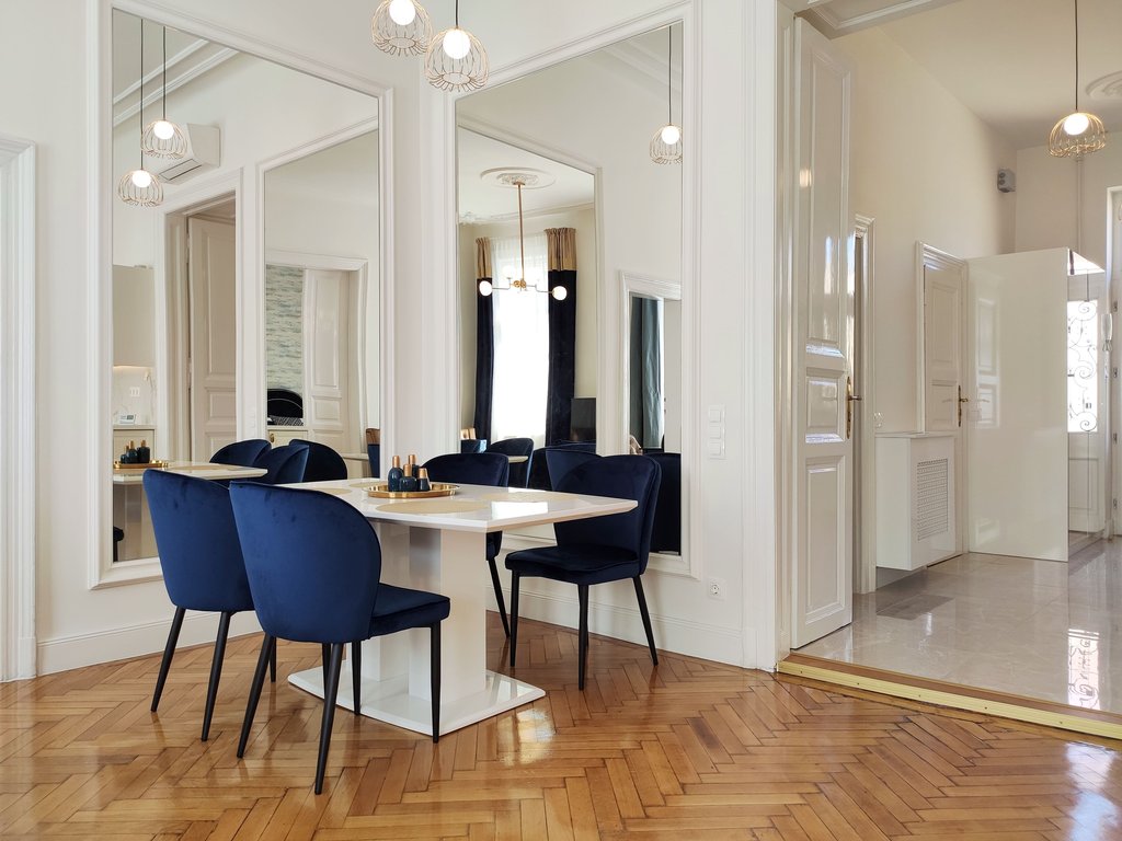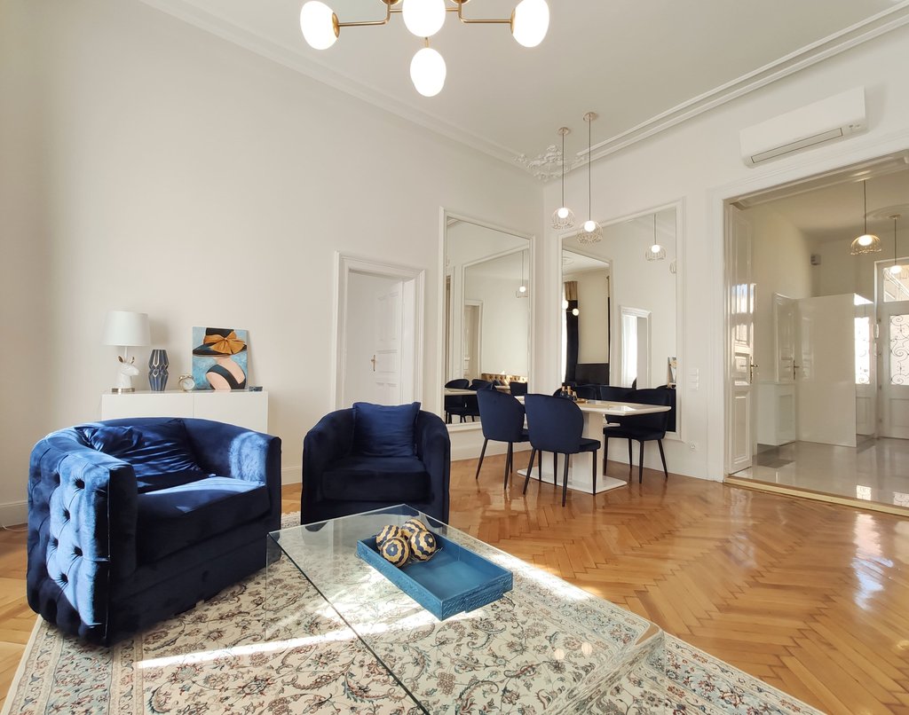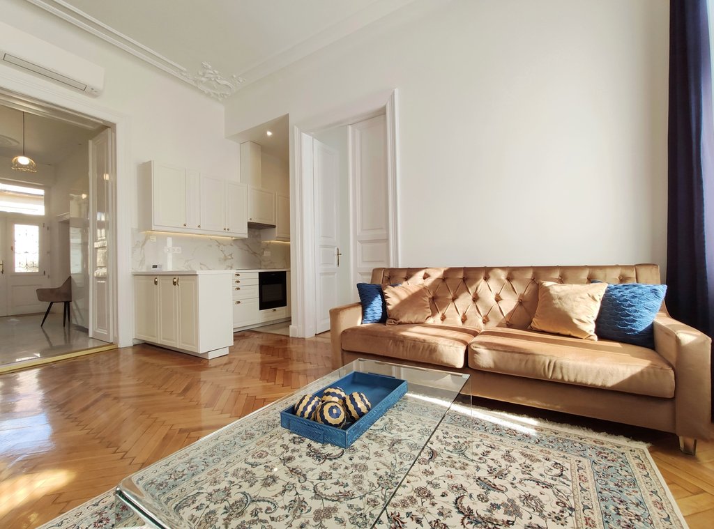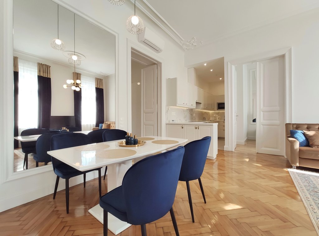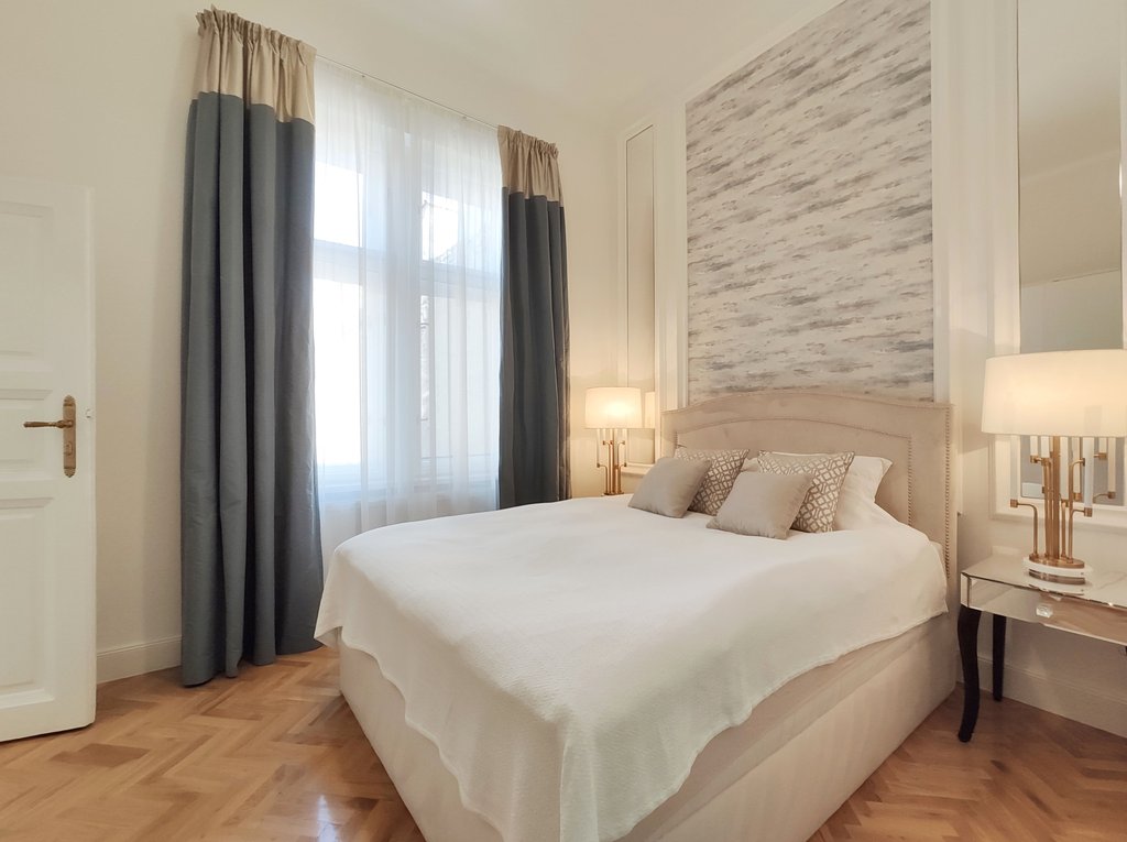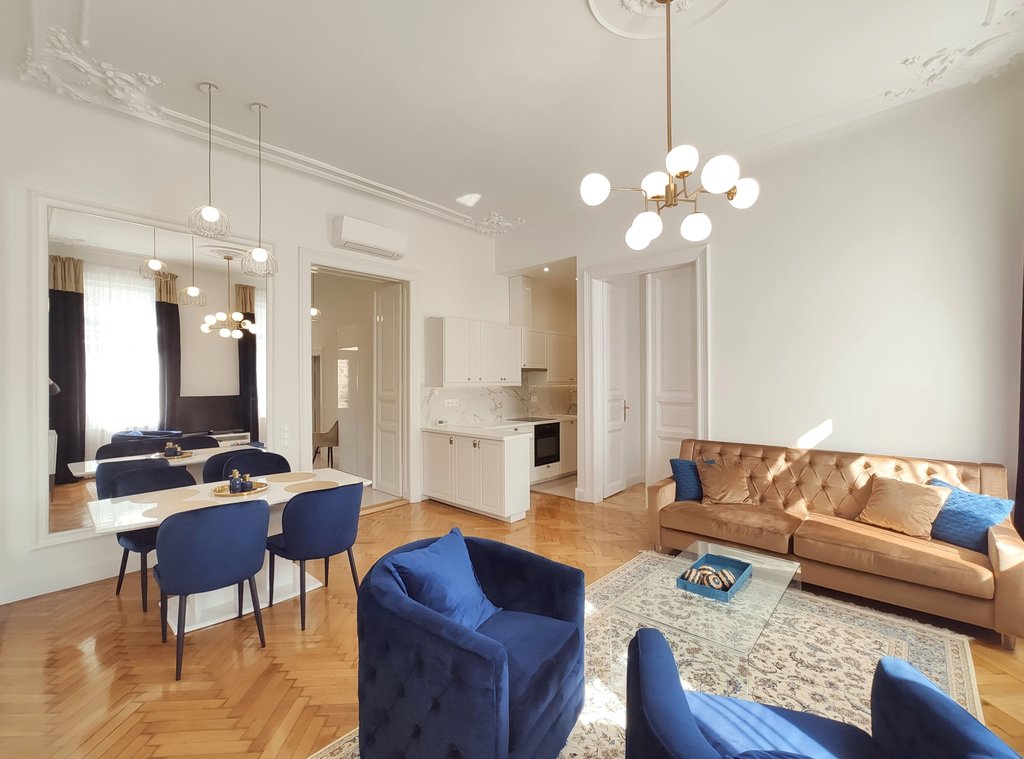 Frissen felújított, elegáns teljesen bútorozott utcai nézetű lakás kiadó a belvárosban, VI. kerületben az Andrássy úttól 1 sarokra. Az negyedik emeleti impozáns lakás 90nm-én kialakításra került egy teljesen felszerelt modern konyha, nappali étkezővel, szülői hálószoba saját fürdőszobával. További helyiségek még 2 hálószoba, egy 1 kádas fürdőszoba és mosókonyha. Az ingatlan légkondicionált és riasztóberendezéssel védett. A környék számos vásárlási és szórakozási lehetőséget kínál, neves divatházak üzletei, szépségszalonok, éttermek, kávézók is néhány perc alatt elérhetőek. Parkolás az utcán lehetséges, illetve a közelben őrzött parkolóházban garázs bérelhető. A tömegközlekedési lehetőségek kiválóak a környéken: Földalatti, villamos, buszmegállók pár lépésnyire találhatóak. Ideális otthont nyújthat pároknak, üzletembereknek, illetve mindazoknak, akik kedvelik a belvárosi nyüzsgést.