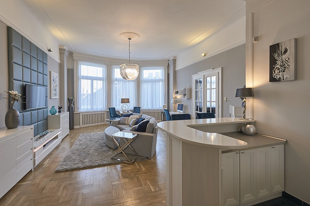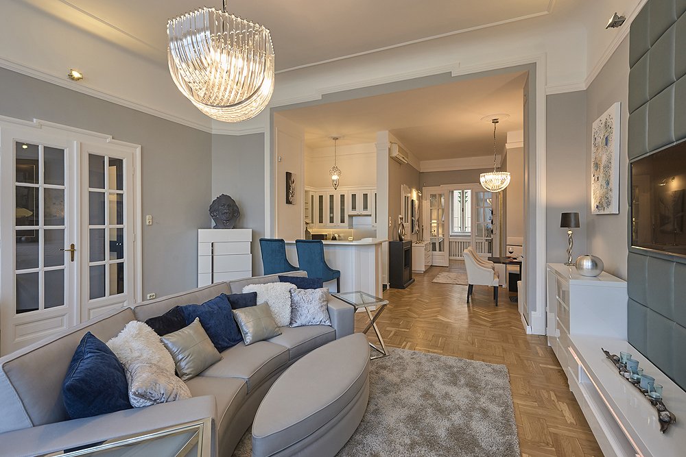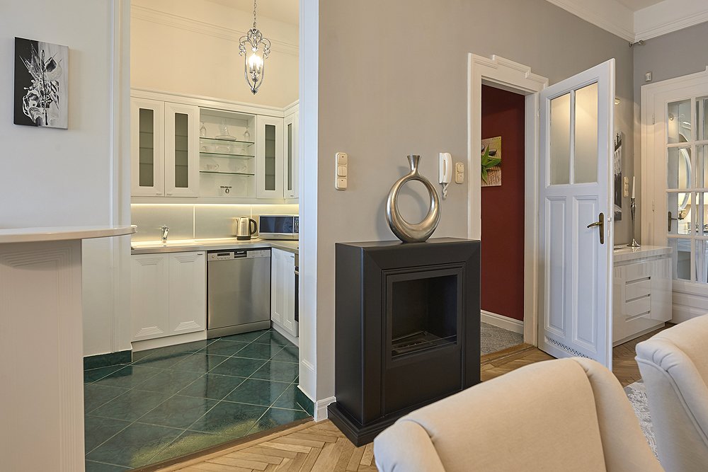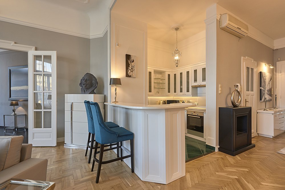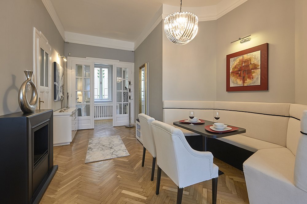 Frissen felújított, elegáns lakás kiadó a belváros szívében. Az 3.emeleti, 87 nm-es ingatlan rendelkezik egy amerikai konyhás nappalival és étkezőrésszel, egy hálószobával, valamint egy kádas fürdőszobával. A lakás ízlésesen bútorozott, légkondicionálóval és riasztóval felszerelt. Különleges belső építészeti megoldások teszik a lakást még stílusosabbá. Közösségi közlekedés szempontjából rendkívül jó a ház elhelyezkedése, három metróvonal, villamos és buszmegállók az épület közvetlen közelében. A Deák Ferenc tér tavasztól őszig rendkívül jó szórakozási lehetőségeket kínál.