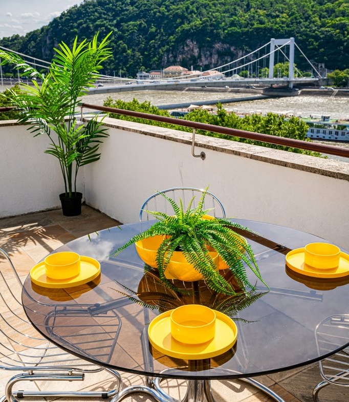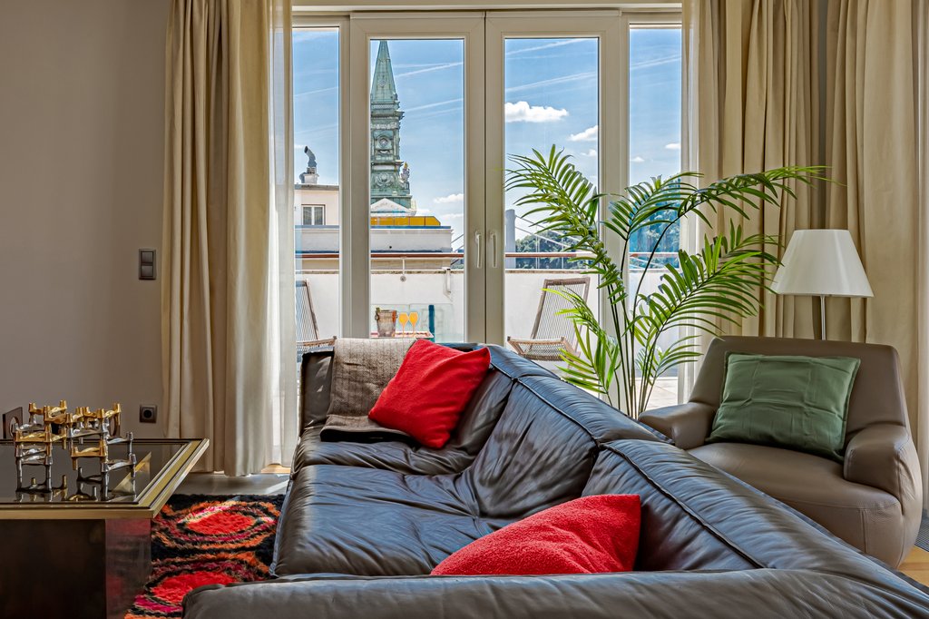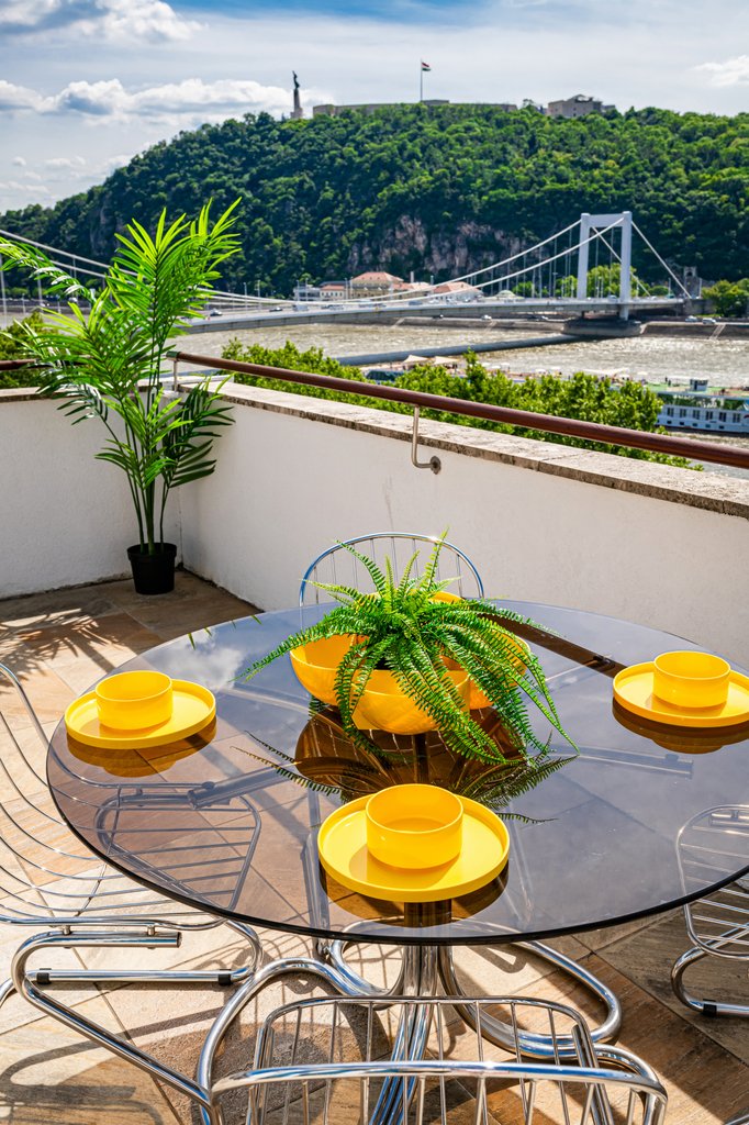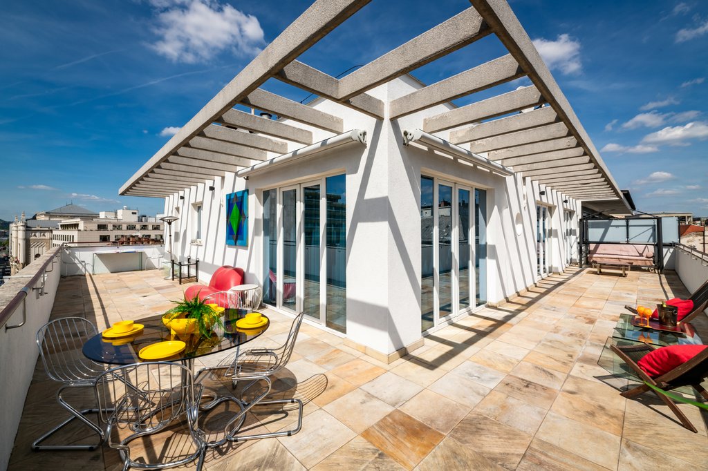 Dunai panorámás, nagy teraszos, napfényes penthouse kiadó a belváros szívében. A legfelső emeleti, designer bútorokkal berendezett, 105 m² -es ingatlanban egy zárt konyha, egy nappali, kettő hálószoba, kettő fürdőszoba (egyikben fürdőkád, másikban zuhanyzófülke), gardrób és mosókonyha található. A hatalmas, 90 négyzetméteres teraszról gyönyörű panoráma tárul elénk. A lift közvetlenül a lakásban áll meg. A lakás légkondícionált és riasztóval felszerelt. Az ingatlan rendkívül jó elhelyezkedésű, villamossal, busszal, metróval könnyen megközelíthető, a közelben neves divatüzletek, éttermek és kávézók találhatók.