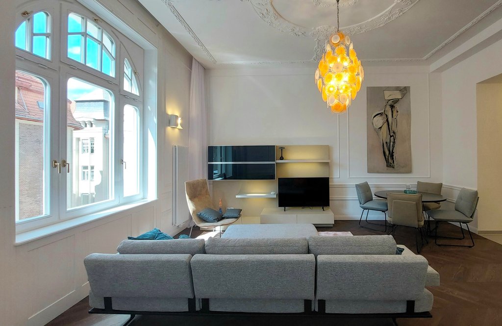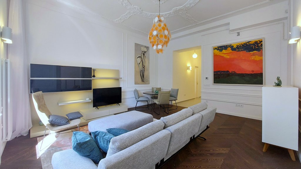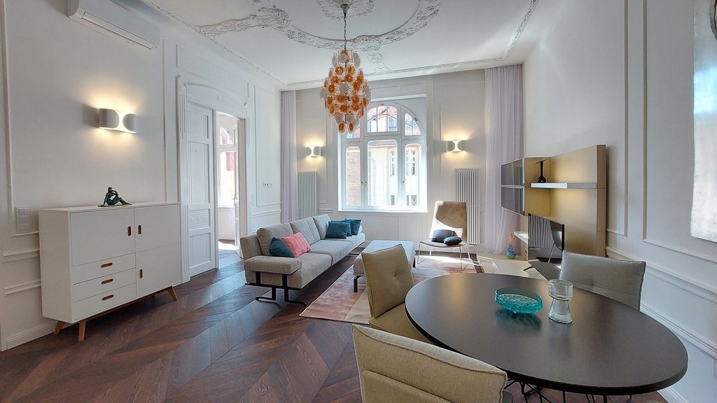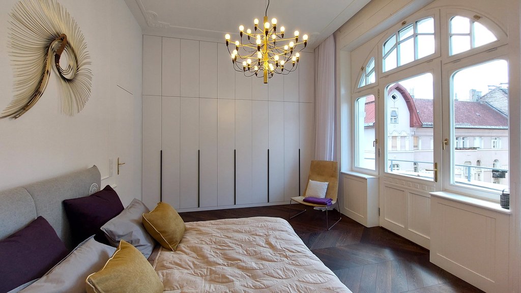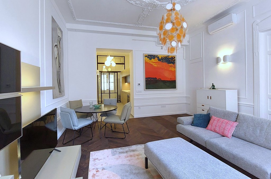 Kiadó a belváros szívében, az V. kerületben egy 75 nm-es, 4. emeleti, igényesen kialakított lakás egy szép, rendezett, liftes társasházban. Az ingatlan két különnyíló hálószobával és két fürdőszobával rendelkezik, tágas, nagy ablakainak köszönhetően rendkívül napfényes nappalival, teljesen felszerelt konyhával és egy hangulatos kis erkéllye. Teljes bútorzattal kiadó, klímával és elektromos redőnyökkel felszerelt, modern és kényelmes otthon, amely ideális választás pároknak vagy igényes bérlőknek. A környék kiváló infrastruktúrával rendelkezik, sétatávolságra éttermek, kávézók, üzletek, tömegközlekedés és a belváros minden előnye.